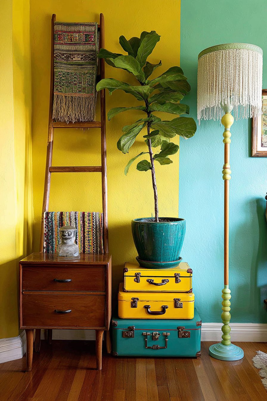 Beside this ladder arrangement stands a mid-century planter stand—perhaps a classic wire and wood design with angled legs and geometric form—holding a large, healthy fiddle leaf fig whose broad, violin-shaped leaves add dramatic organic presence. The plant’s height draws the eye upward while its substantial leaves create architectural impact and improve air quality. The corner walls meet at an angle painted in two different bold colors—mustard yellow on one side and teal on the other—creating a striking color-blocking effect that celebrates the architectural corner rather than trying to minimize it. This confident paint treatment transforms what might be an awkward dead corner into an intentional focal point.