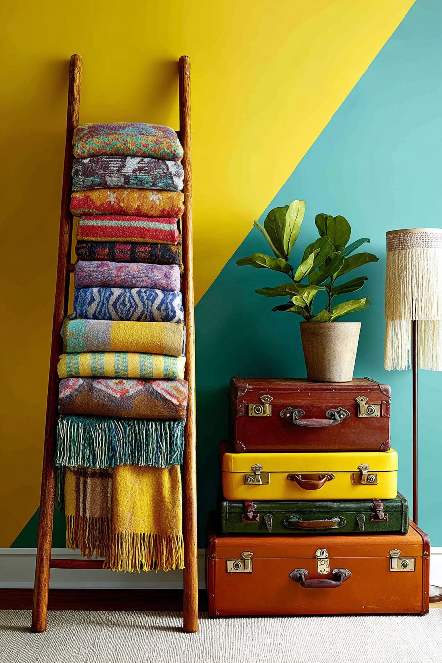 This thoughtfully composed corner demonstrates how small spaces can pack enormous personality through creative repurposing and fearless color application. A vintage wooden ladder—perhaps an old orchard ladder or painter’s ladder with authentic wear and patina—receives new life as a vertical blanket display, each rung holding throws in different patterns and colors. The top rung might feature a lightweight cotton throw in geometric pattern, the second a chunky cable-knit wool blanket in cream, the third a colorful Mexican serape with horizontal stripes, and the bottom a vintage quilt with traditional piecing patterns. This creative storage solution keeps blankets accessible for cozy evenings while creating a sculptural textile installation that adds color, pattern, and texture to the corner.