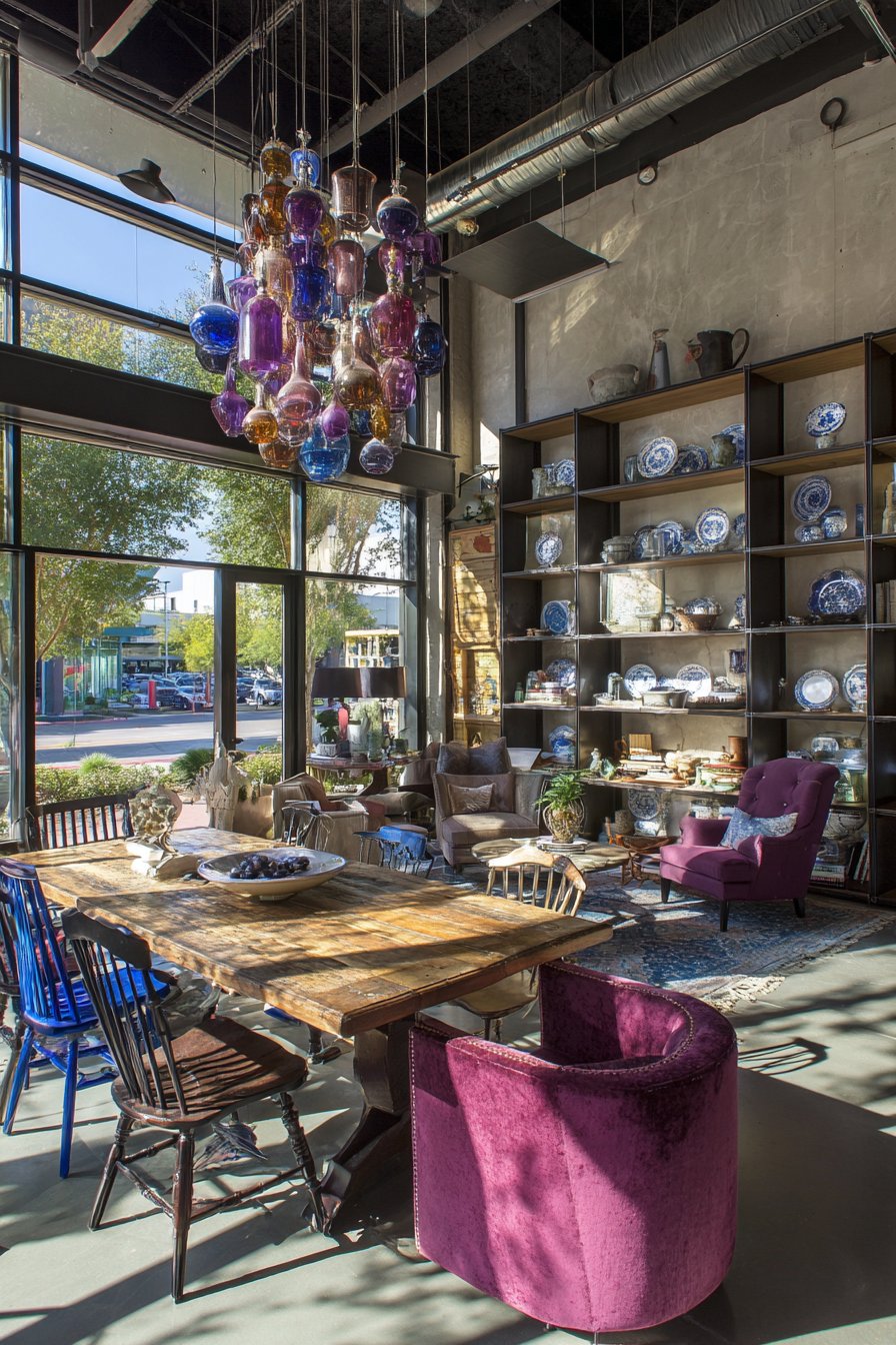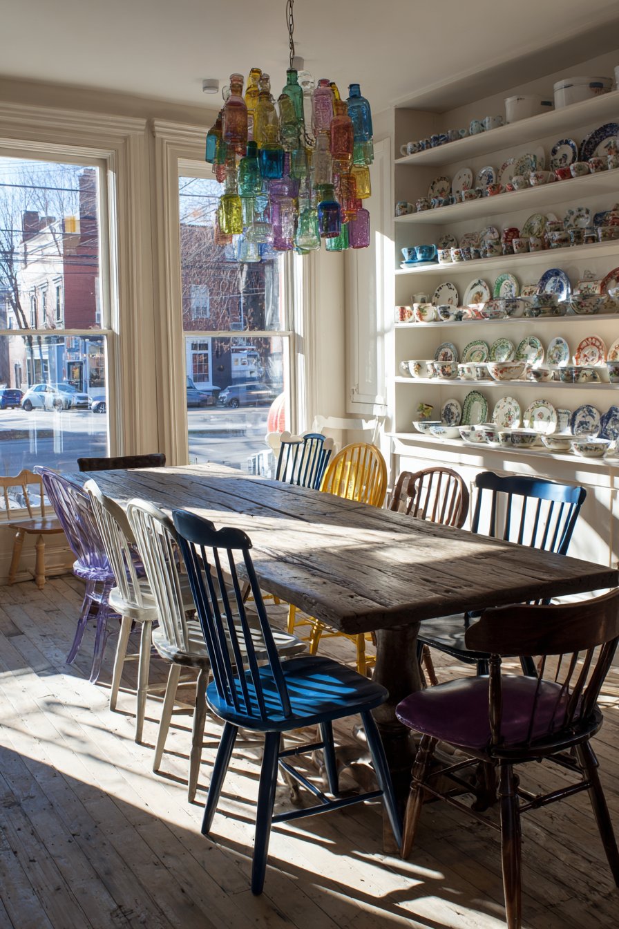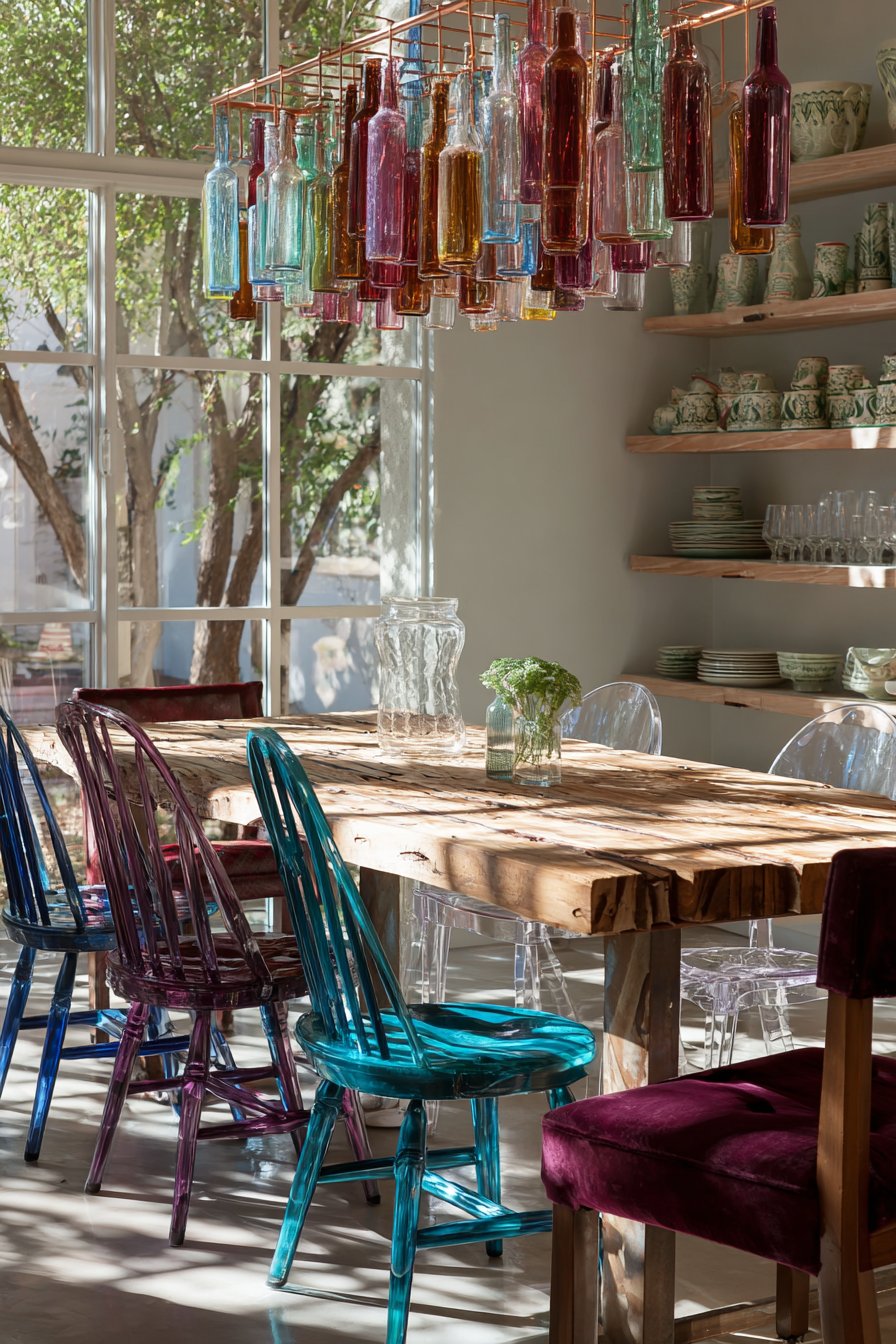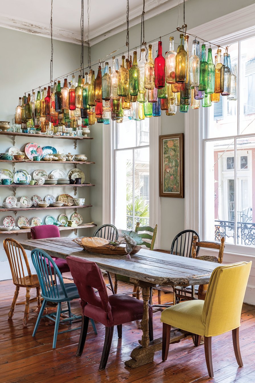 Overhead, a remarkable statement chandelier crafted from colorful glass bottles transforms recycled materials into functional art. This piece might feature bottles in various hues—emerald green, amber, cobalt blue—suspended at different heights to create a sculptural lighting installation that casts colorful light patterns across the table during evening meals. Open shelving along one wall displays a deliberately curated collection of vintage dishware representing different patterns, eras, and origins—perhaps mixing delicate floral china with bold geometric mid-century pieces and rustic stoneware. This display serves both functional and aesthetic purposes, keeping frequently used items accessible while creating a visually engaging focal point.