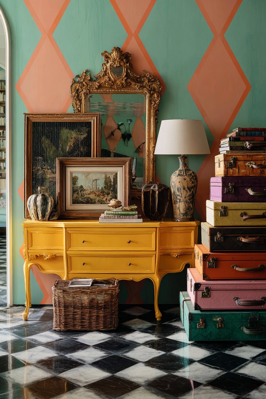 Atop this cheerful console sits a quirky lamp constructed from stacked vintage books, their spines facing outward to display titles and create a literary sculpture topped with a simple drum shade. This DIY-aesthetic piece adds personality and conversation-starting detail while providing essential task lighting. Above the console, an ornate gilt mirror with decorative flourishes and aged patina hangs alongside modern abstract art in a complementary color palette, creating an intentional style clash that epitomizes eclectic design confidence. The floor features classic black and white checkered tile—a timeless pattern that somehow feels both retro and contemporary, providing visual grounding for the colorful walls above.