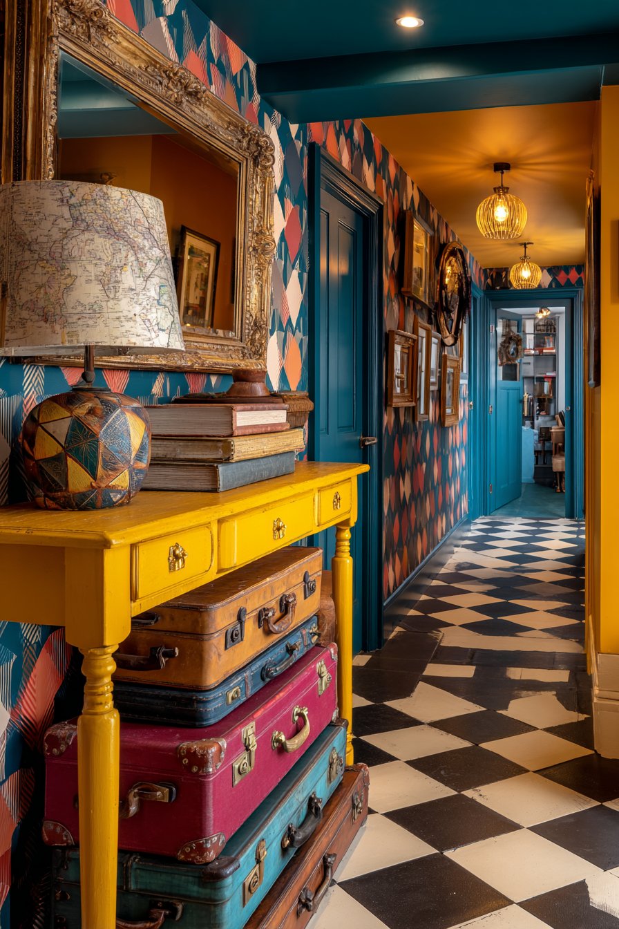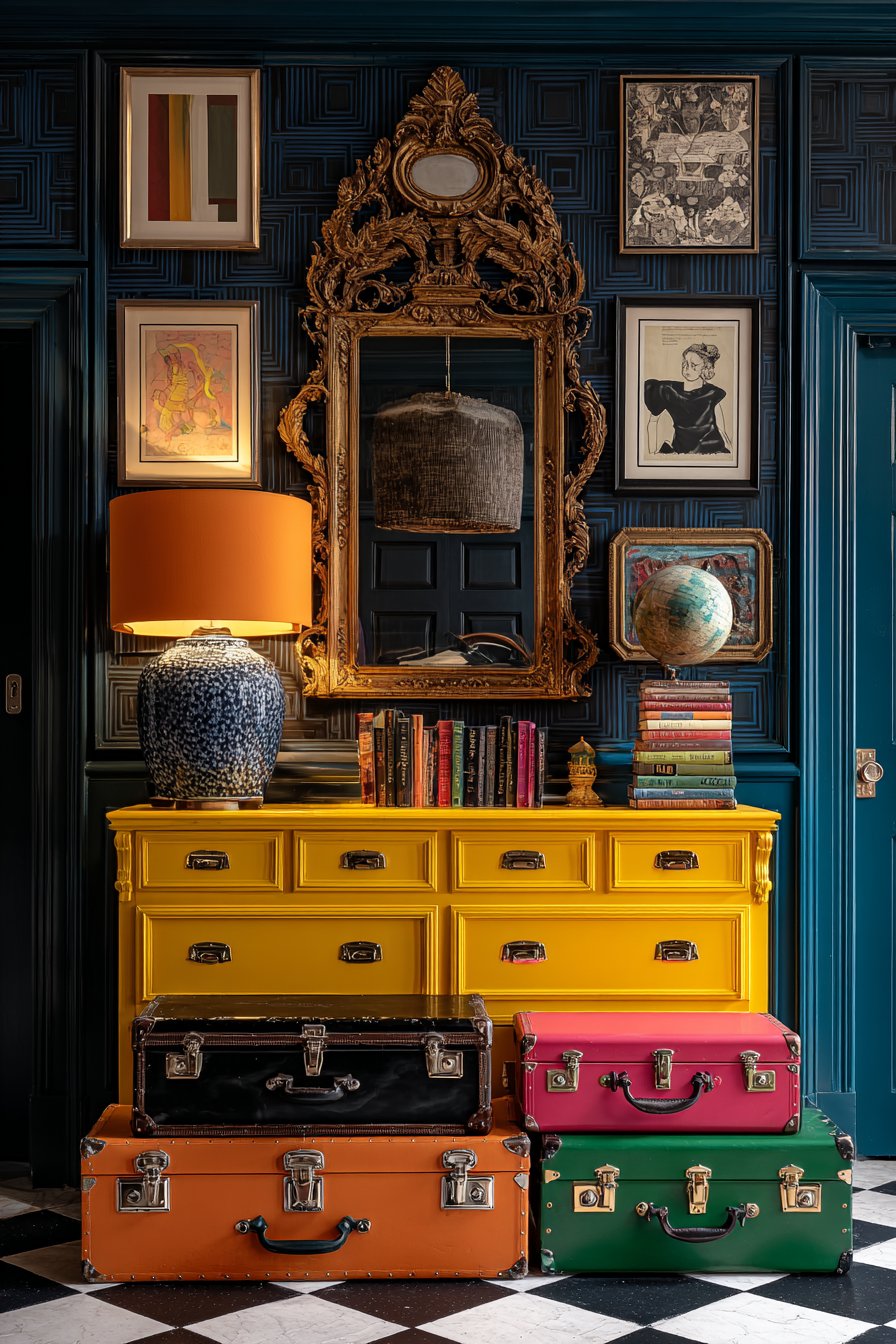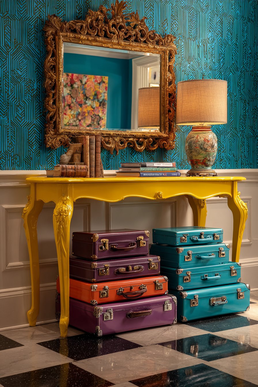 A collection of colorful vintage suitcases stacked vertically creates sculptural storage while adding nostalgic travel-inspired character. These practical pieces might include a robin’s egg blue hard-shell case, a tan leather weekender with brass hardware, and a floral tapestry overnight bag—each contributing color, texture, and story to the space. The wide-angle interior photography captures the entryway’s dramatic first impression, showing how balanced exposure highlights the interplay between the bold wallpaper pattern, the glossy furniture finish, and the various collected objects that give this space its distinctive personality.