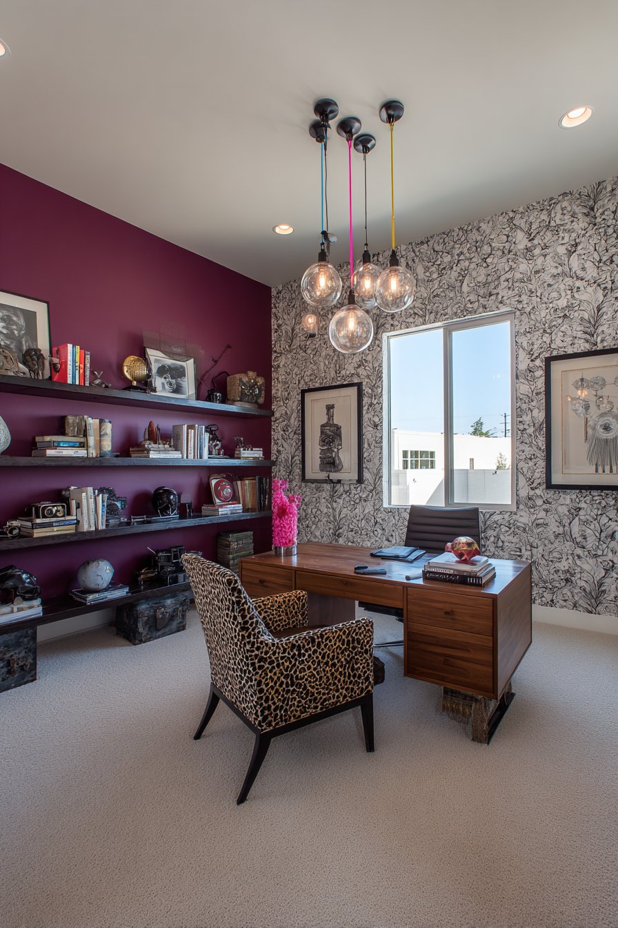 This home office proves that productive workspaces need not sacrifice personality for functionality, instead creating an environment where creativity and focus coexist through bold design choices. A vintage wooden desk with generous proportions and possibly original hardware provides substantial workspace while contributing authentic character and craftsmanship. Paired with this traditional piece is a thoroughly modern ergonomic chair upholstered in leopard print fabric—a daring choice that injects wildness and unexpected glamour into the office environment. This juxtaposition of vintage work surface and contemporary statement seating exemplifies the eclectic principle of mixing eras and aesthetics with confidence.