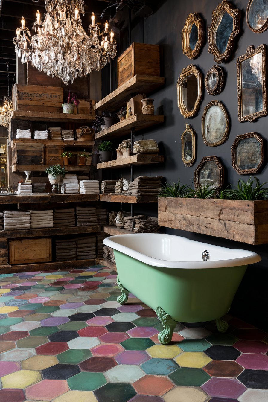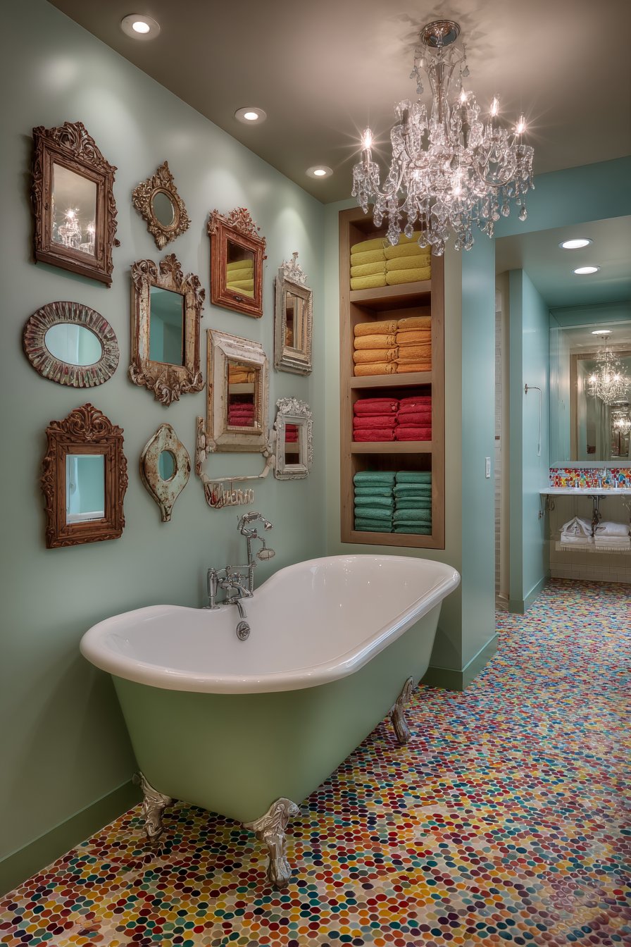Open shelving constructed from reclaimed wood with visible grain, knots, and natural variations provides practical storage while adding organic warmth to balance the room’s more glamorous elements. These shelves display carefully folded colorful towels in solid jewel tones that echo the floor’s rainbow palette, vintage apothecary jars filled with bath salts and cotton balls, and a collection of potted succulents in ceramic containers. One wall features an artistic arrangement of vintage hand mirrors in ornate frames—different shapes, sizes, and finishes creating a three-dimensional gallery that celebrates beauty rituals across eras. Professional interior photography with soft diffused lighting highlights the sophisticated playfulness, showing how this bathroom balances whimsy with functionality.