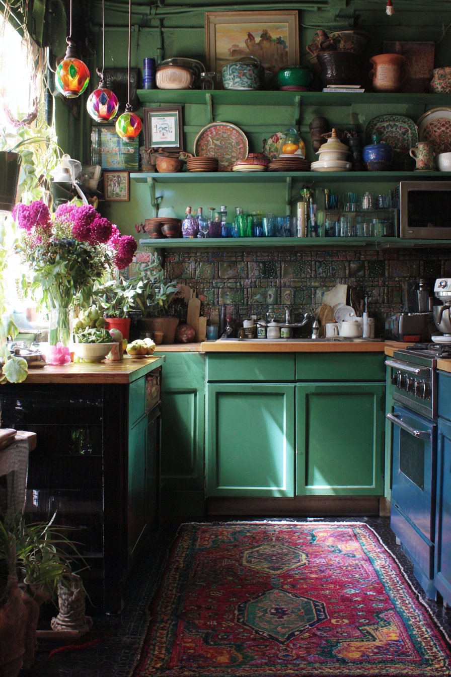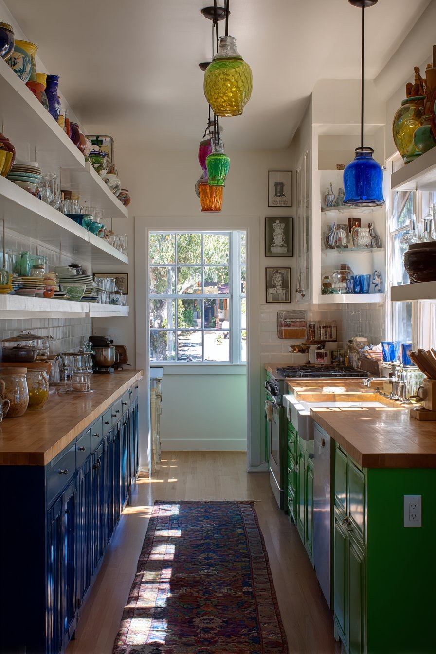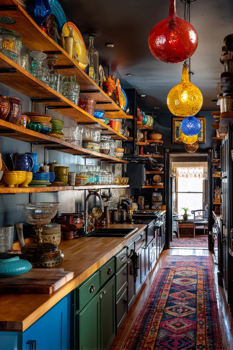 A vintage Persian runner in rich jewel tones with traditional geometric or floral motifs adds pattern to the floor while protecting high-traffic areas and introducing another layer of color and history. Overhead, pendant lights feature colorful glass shades in different shapes—perhaps one dome, one cone, one globe—creating an eclectic lighting installation that provides focused task lighting over work areas while serving as functional sculpture. Wide-angle photography captures the full kitchen space bathed in natural daylight from windows, emphasizing the collected-over-time aesthetic where each element appears chosen for both function and beauty, creating a cooking space that inspires creativity and nourishes both body and spirit.