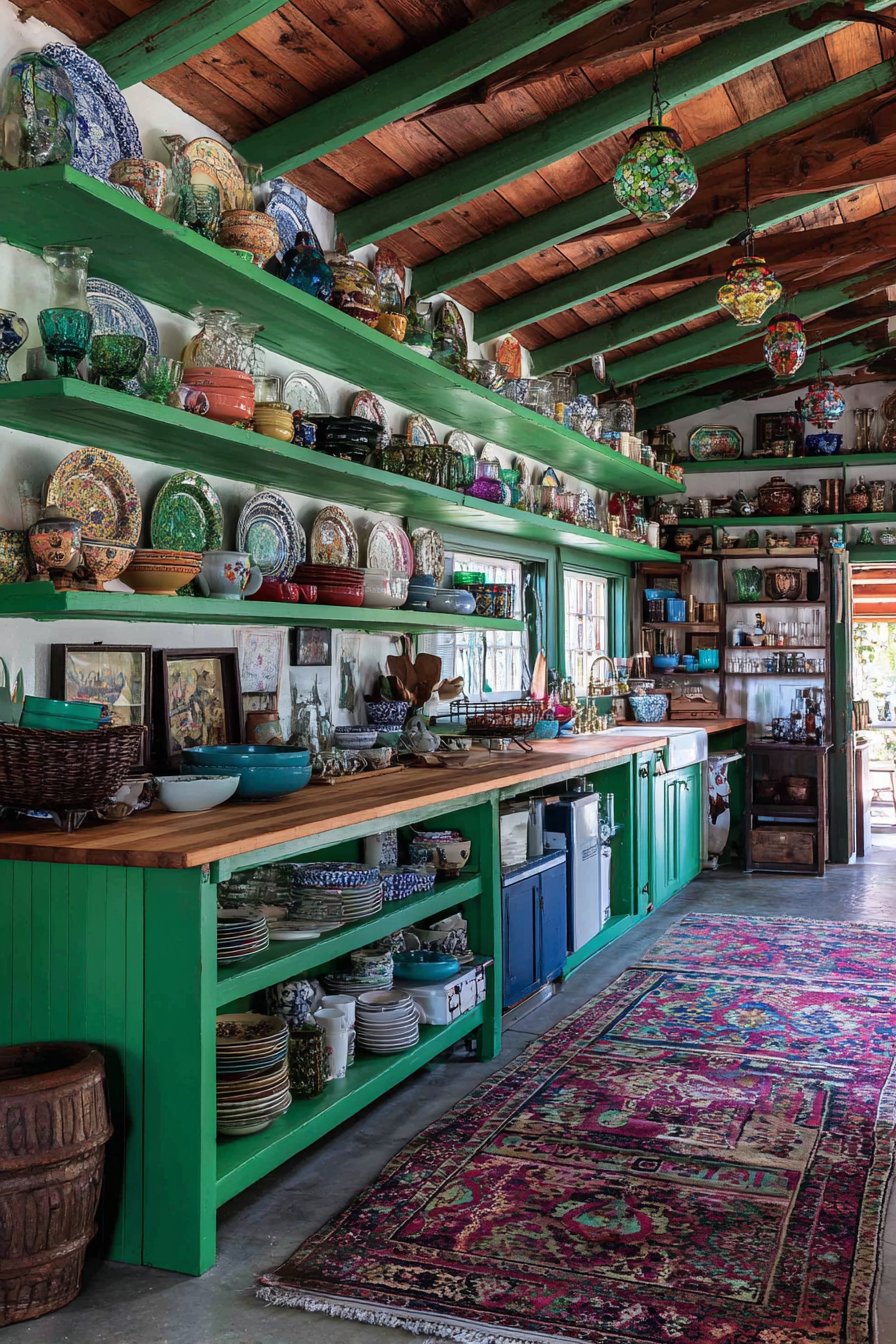 Butcher block countertops spanning both colored cabinet sections provide warm, natural contrast to the saturated cabinet colors while offering practical, renewable work surfaces ideal for food preparation. The visible wood grain and honey tones create visual breathing room between the bold cabinet colors and the display areas above. Open shelving replaces upper cabinets, showcasing a deliberately mismatched collection of vintage dishes representing different eras, patterns, and manufacturers—perhaps mixing delicate floral transferware, bold mid-century geometric designs, and rustic hand-thrown pottery. Colorful glassware in various hues catches light and adds transparent pops of color, while pottery pieces in varied glazes contribute textural and chromatic interest.