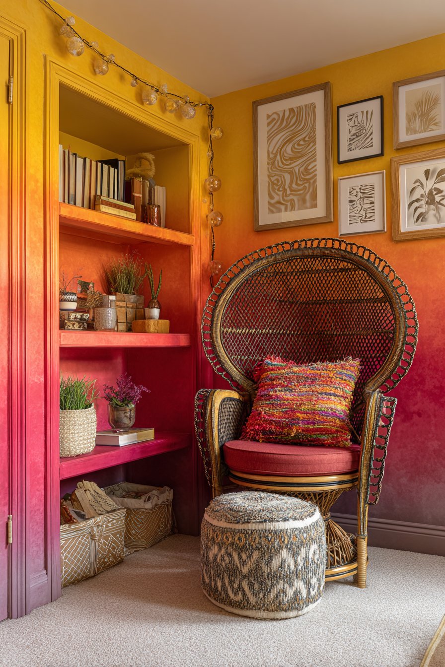 The bookshelf itself undergoes a transformative treatment with gradient-painted backing or sides transitioning from yellow at the bottom through orange to red at the top, creating a warm, energizing rainbow effect that celebrates color’s emotional power. This painted gradient serves as both artwork and functional storage, turning a practical shelving unit into a statement piece that elevates the entire space. The books themselves might be arranged by color to enhance this rainbow effect, creating visual harmony while making the collection feel curated and intentional. A Moroccan leather pouf in rich color—perhaps deep burgundy or bright turquoise—serves as a versatile footrest, additional seating, or impromptu side table for tea and reading glasses.