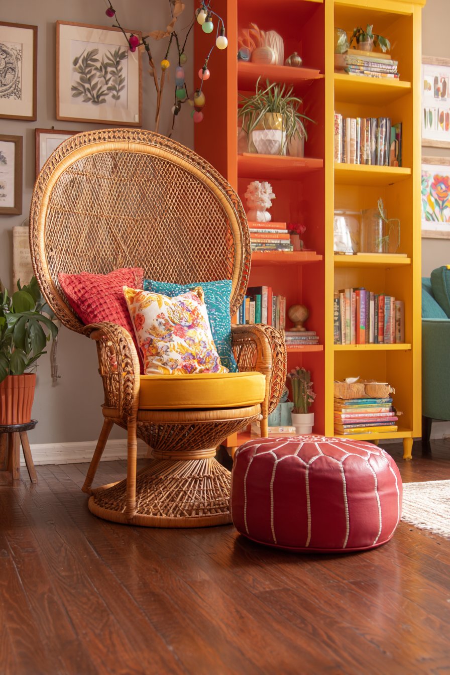 This reading nook creates an intimate sanctuary dedicated to literature and contemplation, featuring a curved vintage rattan peacock chair whose dramatic fan back and intricate woven pattern make it a sculptural focal point. The natural rattan material provides organic texture and bohemian character, while vibrant cushions in mixed patterns—perhaps combining geometric prints, floral textiles, and ethnic-inspired designs—transform the chair into a supremely comfortable reading throne. Positioned beside a floor-to-ceiling bookshelf, this seating creates the perfect relationship between reader and literature, making book selection effortless and creating an immersive literary environment.