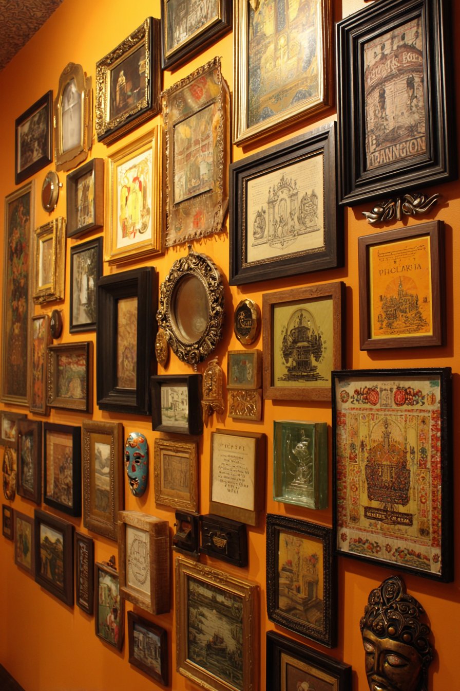 Textile art adds dimensional and tactile interest—perhaps a small woven wall hanging in earth tones, an embroidered piece featuring folk art motifs, or a framed vintage textile sample showing traditional patterns. Small mirrors in various shapes and sizes reflect light and create depth, their reflective surfaces adding interactive elements that change as viewers move past. Three-dimensional objects break the two-dimensional plane: African masks with carved wood and authentic patina, sculptural ceramic pieces mounted on shadow boxes, small architectural fragments, or found object assemblages that blur the line between art and artifact. Frames vary wildly in style, color, and size—massive ornate baroque frames in distressed gold, sleek modern aluminum, rustic weathered wood, painted frames in unexpected colors—creating visual rhythm through contrast rather than repetition.