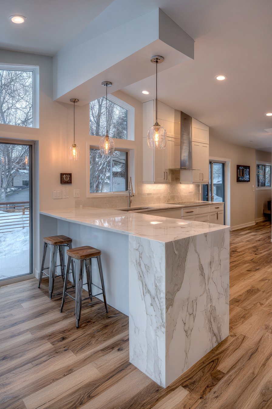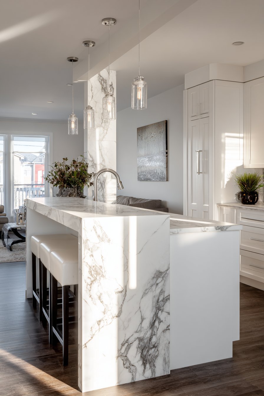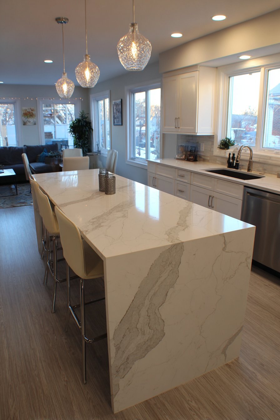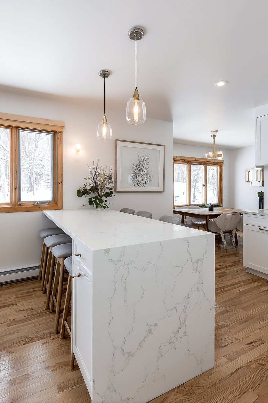 The foundation of this half wall consists of white shaker-style cabinetry that provides valuable storage while maintaining a clean, classic aesthetic that never goes out of style. Three minimalist bar stools tucked neatly beneath the overhang create an intimate dining spot perfect for quick breakfasts or casual entertaining. The pendant lights suspended above the bar area serve a dual purpose—providing task lighting for dining while adding a decorative element that draws the eye upward and emphasizes the ceiling height. The interplay between the white cabinetry and the gray-veined quartz creates a sophisticated neutral palette that works beautifully with virtually any decorating scheme.