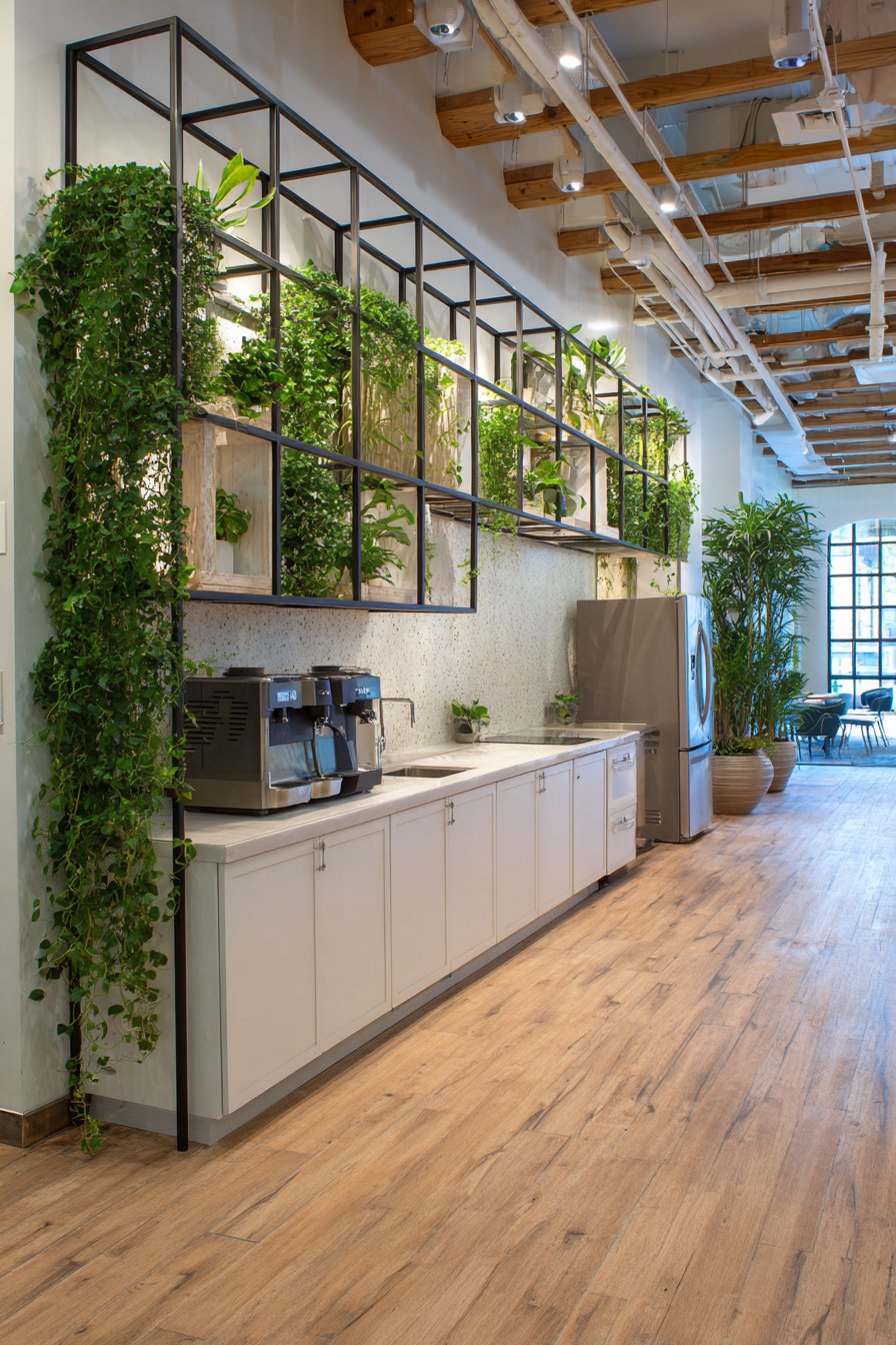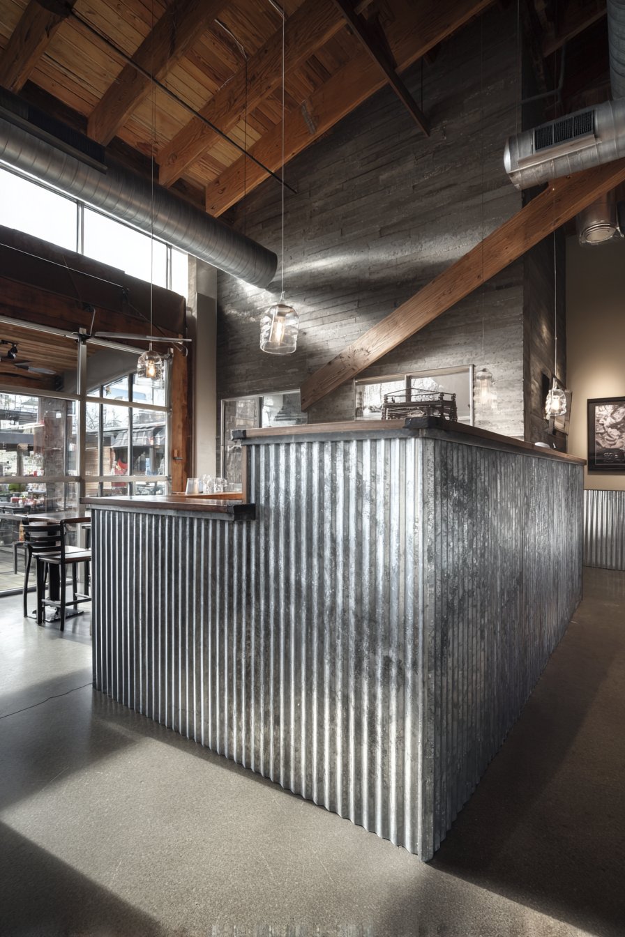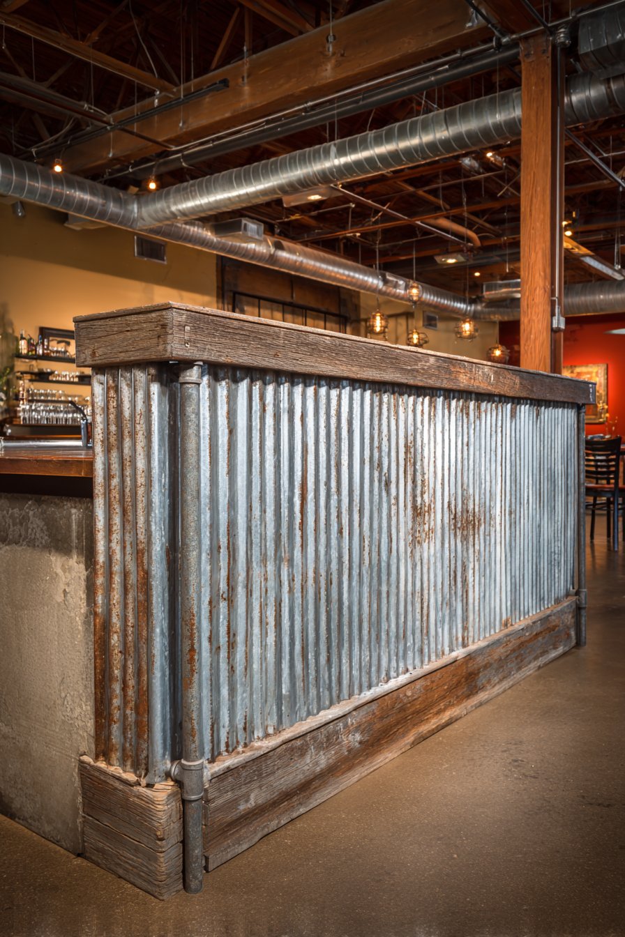 Industrial materials find new life in residential applications when selected and installed with design sensitivity, as demonstrated by this urban-industrial partition using corrugated metal panels in weathered zinc finish. Creating a distinctly city-loft aesthetic, this half wall separates the kitchen prep area from the dining space in a converted warehouse apartment. Standing 40 inches high, the corrugated panels showcase exposed rivets and authentic patina that celebrate industrial manufacturing processes rather than concealing them behind finished surfaces.