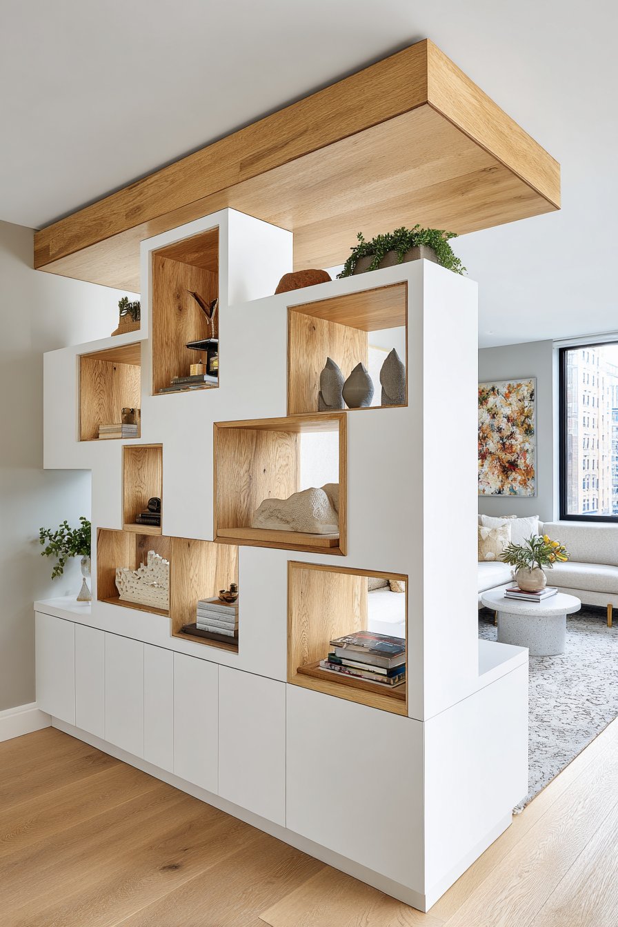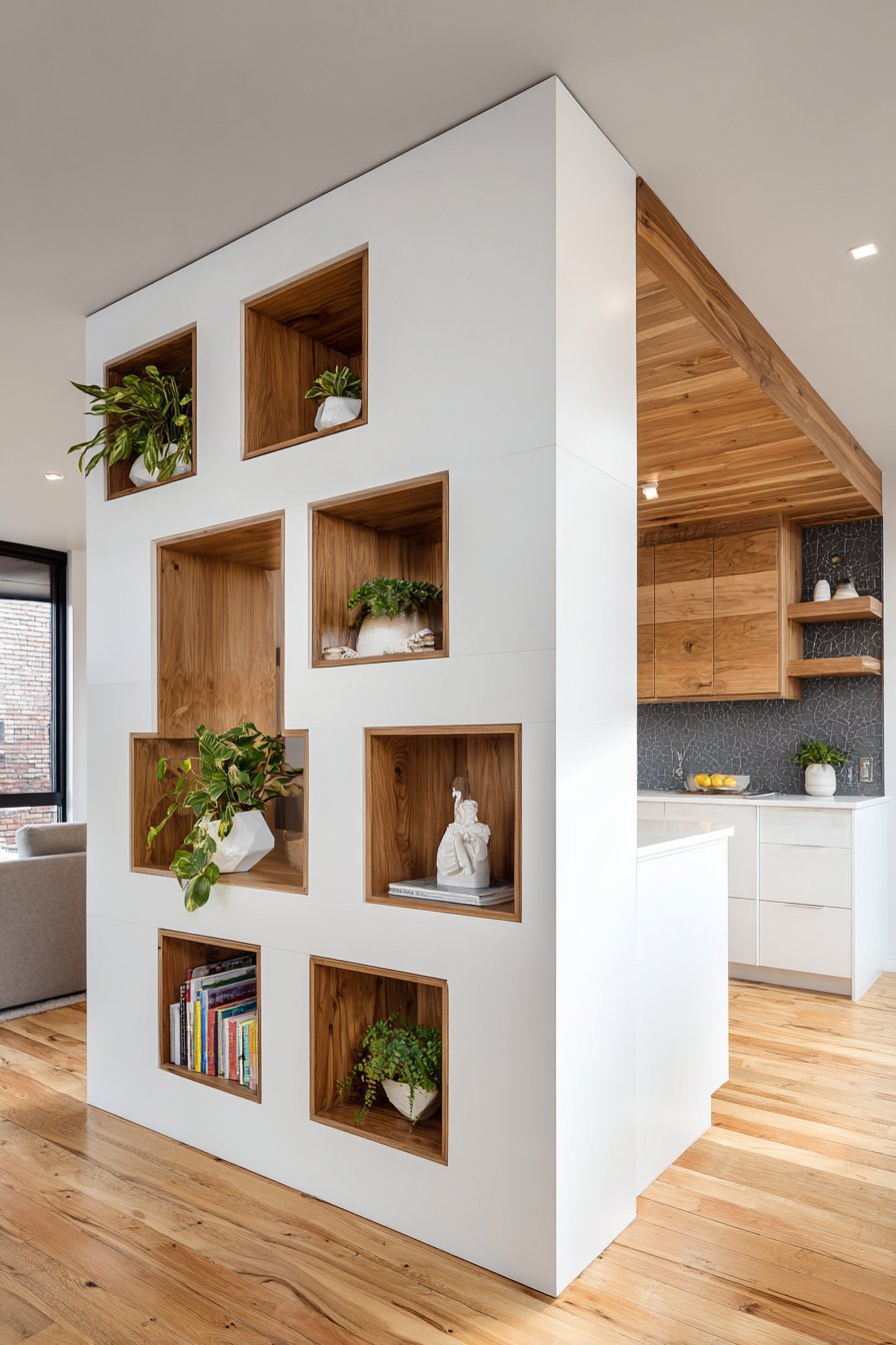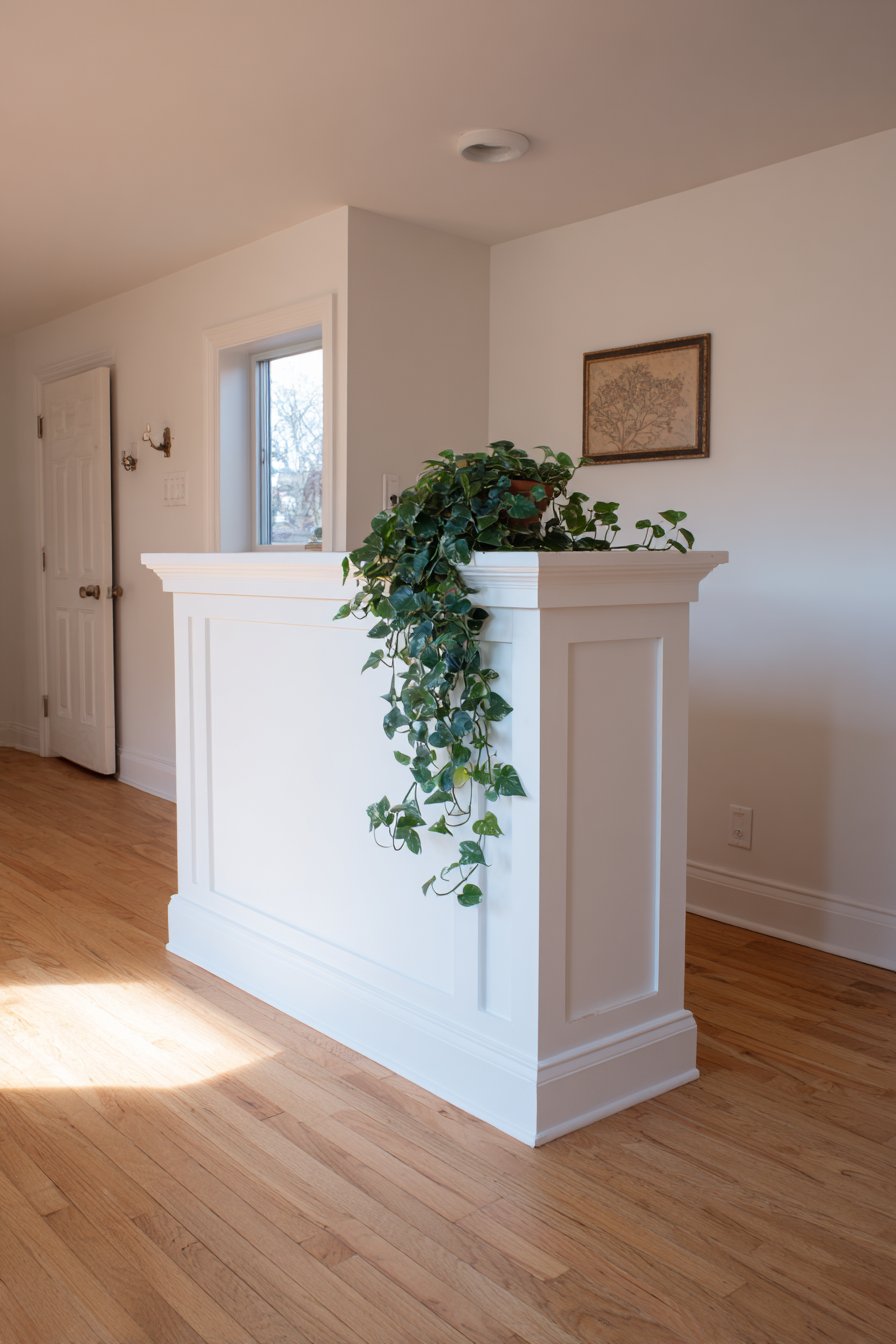 Functionality reaches new heights in this ingenious half wall design that transforms a simple room divider into valuable storage space through the integration of built-in shelving. The white painted framework incorporates four generously sized open cubby sections, each providing display space for carefully curated collections of decorative objects, books, and living plants that add personality and life to the partition. This dual-purpose approach maximizes the utility of every square foot, particularly valuable in homes where space is at a premium and every element must earn its place through multi-functionality.