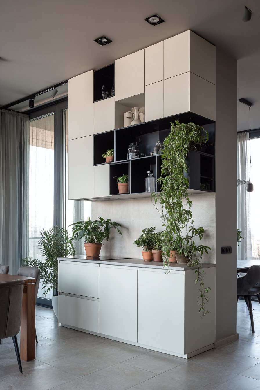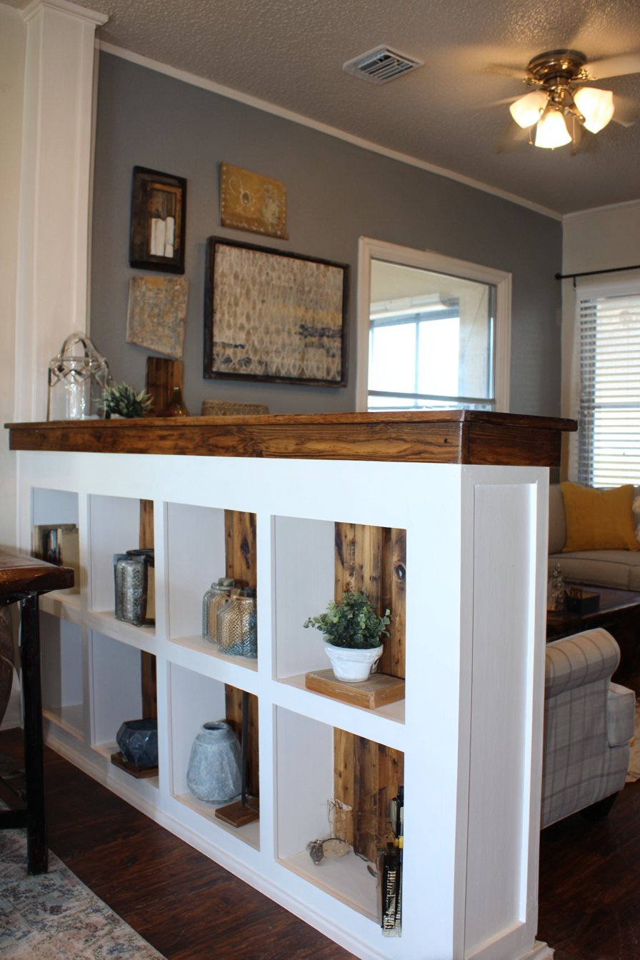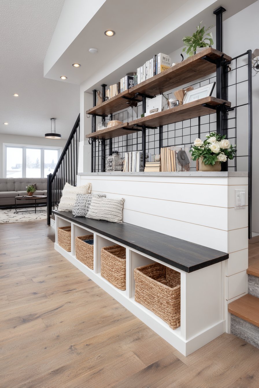 Functionality reaches new heights in this ingenious half wall design that transforms a simple room divider into valuable storage space through the integration of built-in shelving. The white painted framework incorporates four generously sized open cubby sections, each providing display space for carefully curated collections of decorative objects, books, and living plants that add personality and life to the partition. This dual-purpose approach maximizes the utility of every square foot, particularly valuable in homes where space is at a premium and every element must earn its place through multi-functionality.