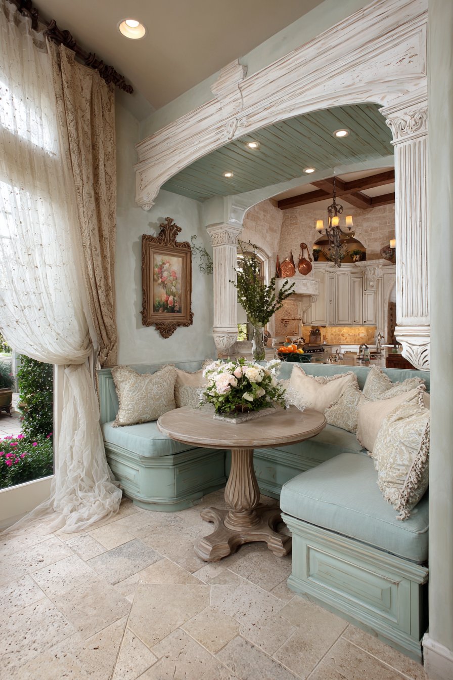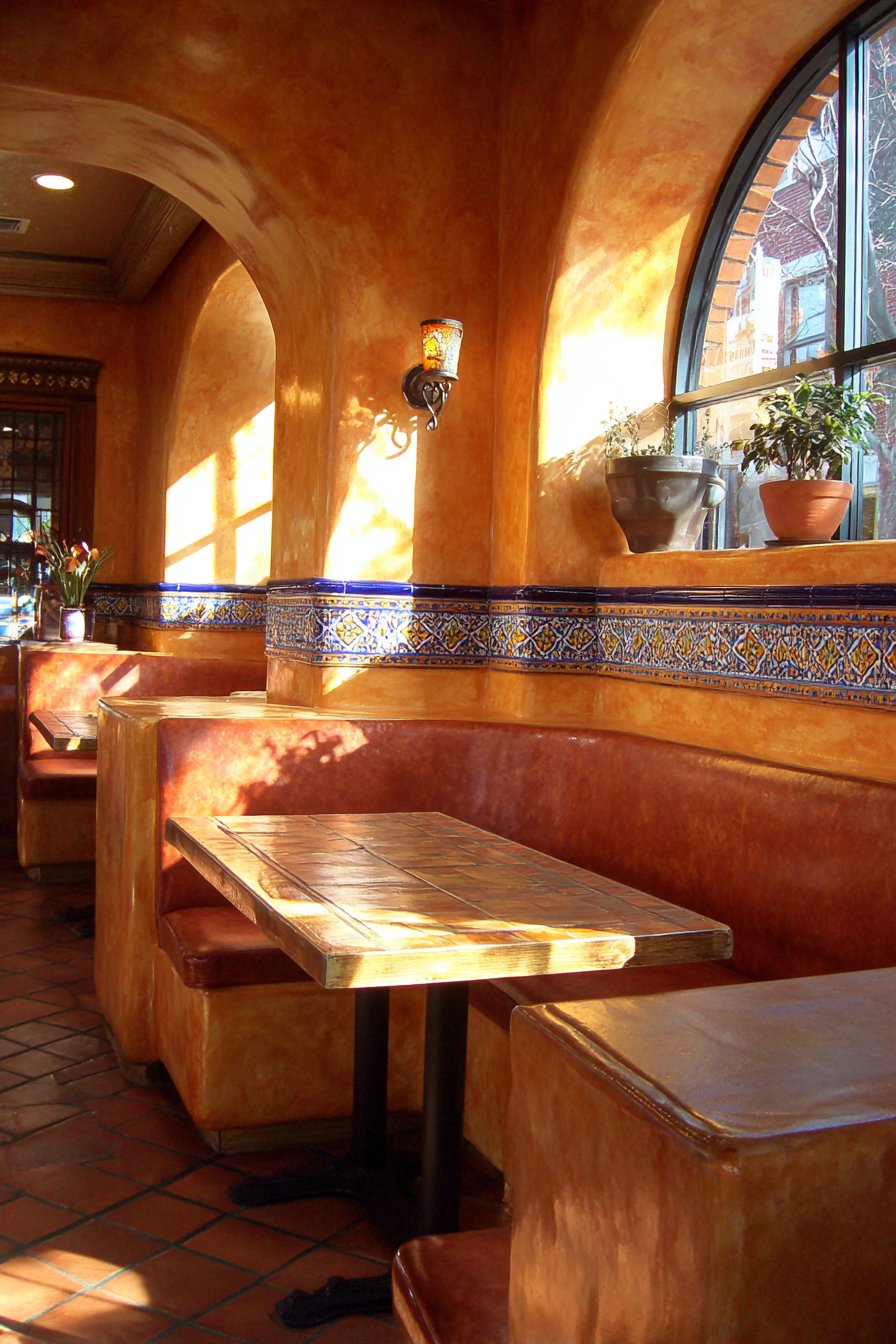 The romance and warmth of Mediterranean design comes alive in this beautifully crafted half wall featuring traditional stucco finishing and graceful arched openings that frame views between adjacent spaces. The structure serves as an elegant separator between a sun-drenched dining area and an intimate reading nook, incorporating three decorative arched cutouts that allow visual connection while maintaining distinct functional zones. The stucco finish in warm ochre tones evokes the sun-baked walls of Tuscan villas and Spanish courtyards, bringing a sense of Old World charm and timeless elegance to contemporary homes.