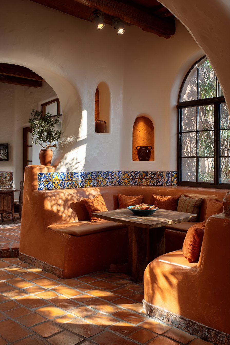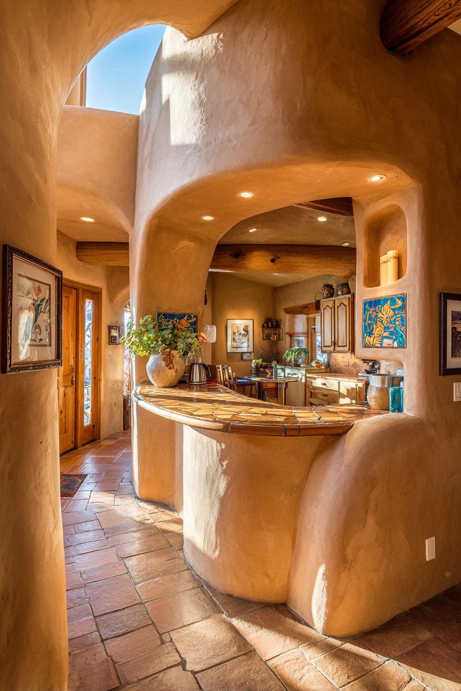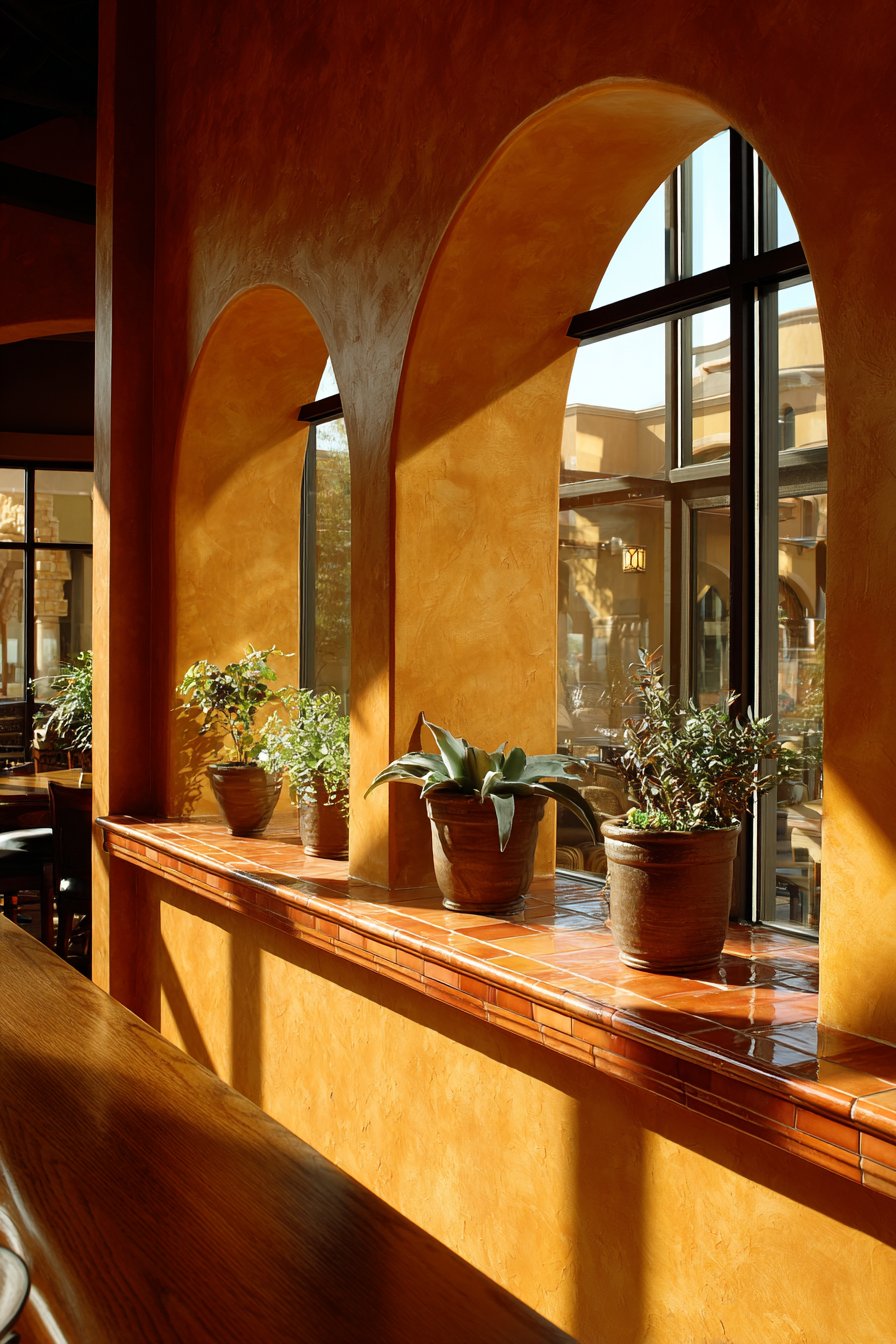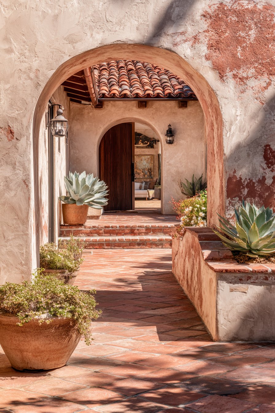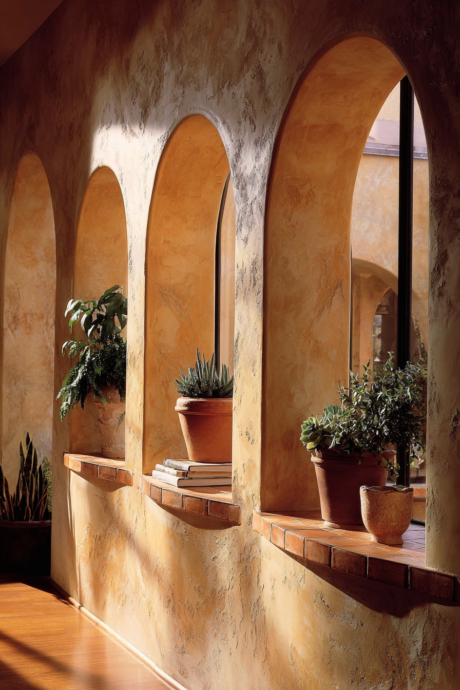 The arched openings represent more than mere decorative flourishes—they serve practical purposes by allowing light and air to circulate freely between spaces while creating beautiful framed vistas that draw the eye through the home. Terra cotta tiles topping the wall edge introduce rich earth tones and provide textural contrast against the smoother stucco surfaces, while also protecting the upper edge from wear and damage. Potted succulents nestled within the arched niches add living green elements that thrive in the bright natural light these openings admit, creating miniature garden moments that bring life and vitality to the architectural features.