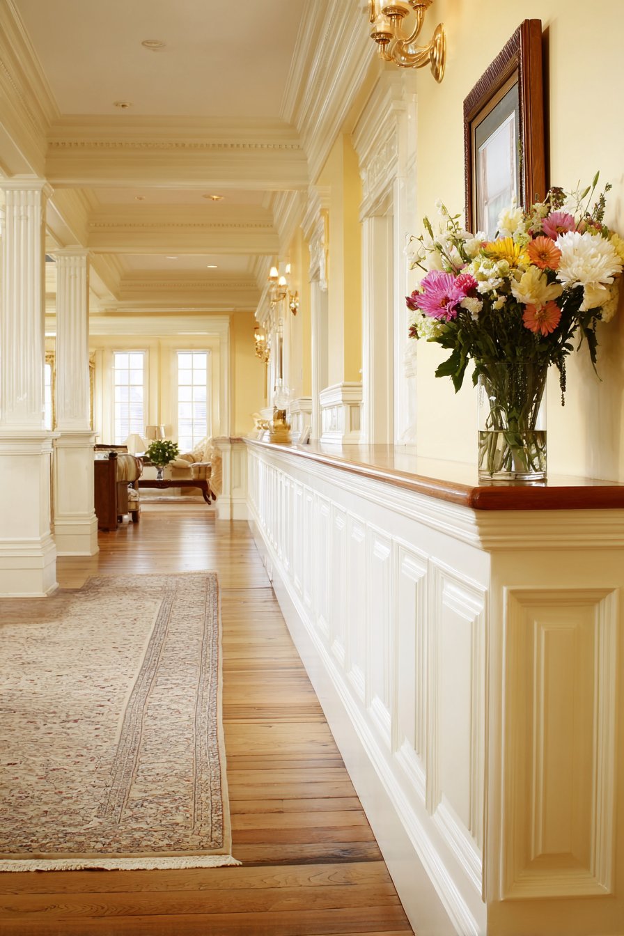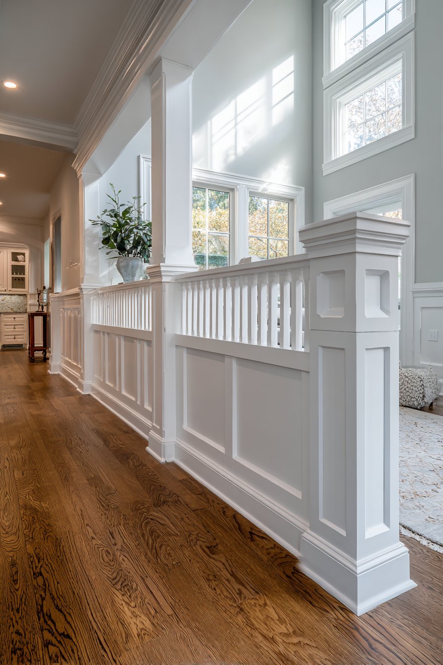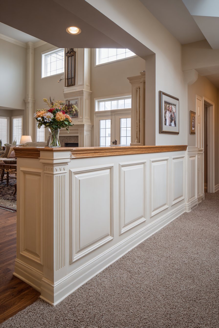 The architectural detailing in this design serves both aesthetic and practical purposes. The wainscoting panels add texture and visual interest to what might otherwise be plain wall surfaces, while the substantial cap rail provides a convenient surface for displaying personal touches like family photographs or fresh flowers in decorative vases. This practical display space allows homeowners to personalize the area and create a welcoming first impression without requiring additional furniture or wall-mounted shelving. The transition from carpeted living room to hardwood hallway flooring is elegantly managed by the half wall, which helps define the boundary between these different zones while allowing them to flow naturally into one another.