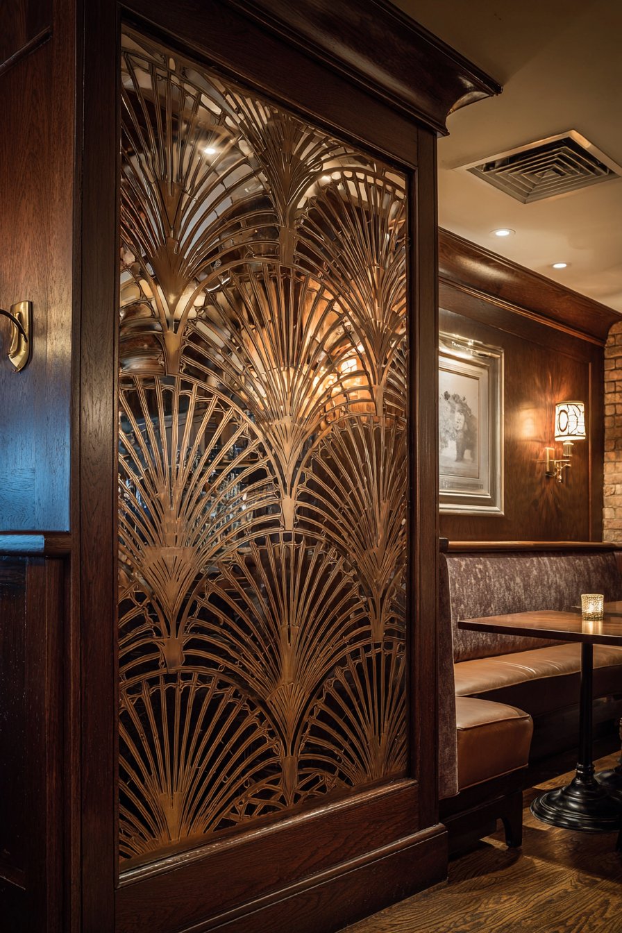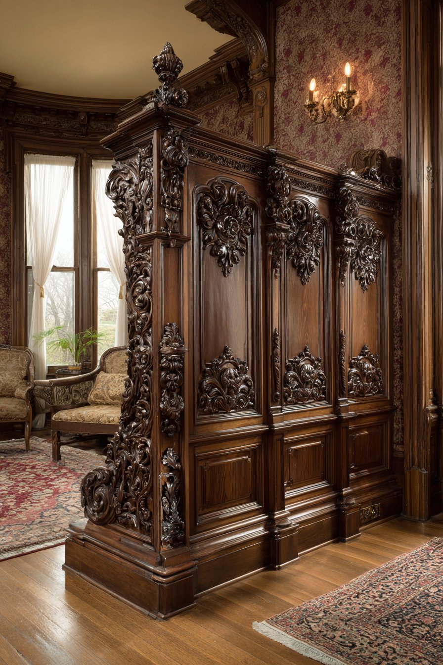 Natural light from tall windows creates depth and highlights the fine woodcarving details, emphasizing the dimensional quality of the acanthus leaf carvings and showing how light plays across the carved surfaces differently throughout the day. Interior design photography captures the historic grandeur and craftsmanship that defines Victorian design at its finest, demonstrating how period-appropriate detailing and premium materials create architecture that remains impressive and valuable more than a century after construction. This partition represents Victorian design philosophy perfectly—celebrating abundance, skilled craftsmanship, and unabashed decorative richness rather than the restraint that would characterize later design movements.
