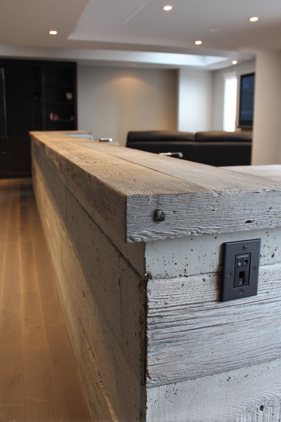 Warm natural light filtering through the space emphasizes the varied tones and textures within the reclaimed wood, from silvery gray weathered sections to deeper brown areas where the original wood color remains more saturated. Wide-angle interior photography captures how effectively this half wall defines separate zones while maintaining the open, welcoming quality essential to family-friendly spaces. The authentic material details—including natural wood grain patterns, checks and splits from decades of weather exposure, and subtle color variations from board to board—create visual richness that manufactured materials simply cannot replicate.