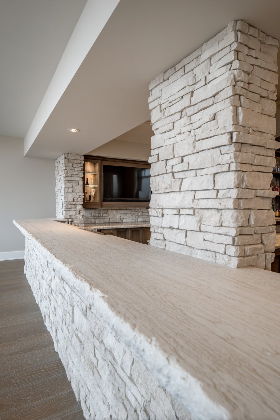 The boundary between indoor and outdoor living blurs beautifully in tropical and resort-style homes, a design philosophy perfectly embodied in this half wall using natural stone veneer in stacked ledgestone pattern. Creating textural separation between an indoor-outdoor living space and interior dining area, this partition celebrates natural materials while maintaining the flowing, connected quality essential to tropical design. The earth-tone stones in warm grays and tans with natural variation create organic visual interest, each stone’s unique shape and color contributing to an overall composition that celebrates rather than conceals nature’s irregularity.