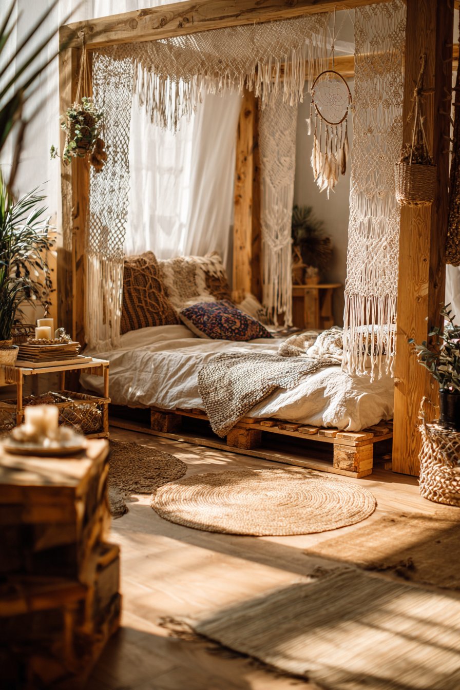 - Layer multiple natural fiber rugs in complementary colors and patterns for authentic bohemian layering
