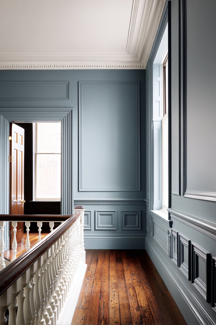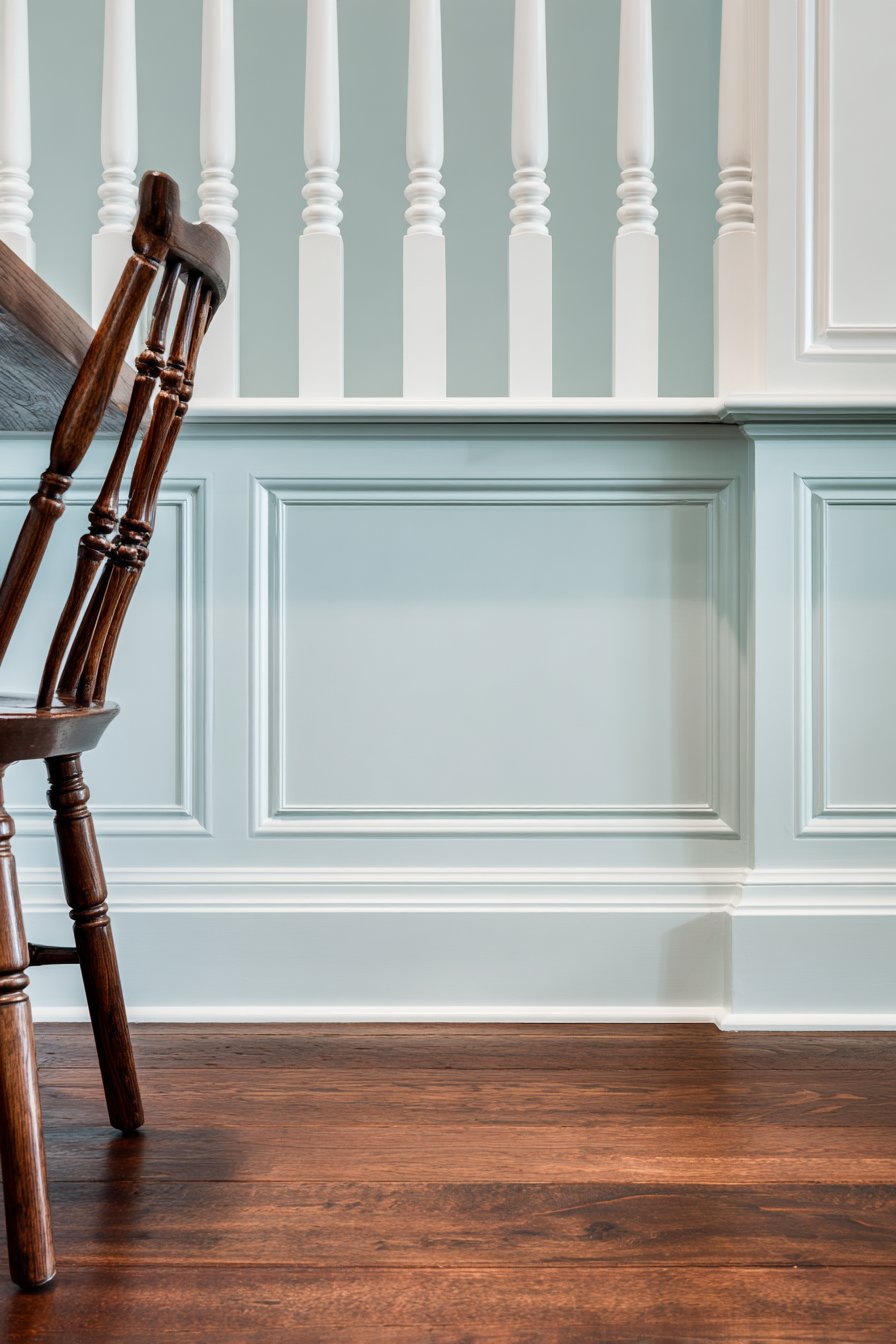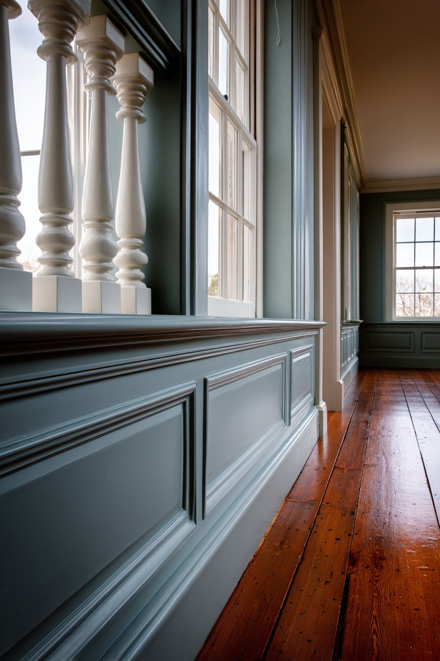 Traditional American colonial architecture emphasized proper proportion, classical detailing, and quality craftsmanship—principles beautifully embodied in this formal half wall separating a proper parlor from the main hallway. The raised panel wainscoting in the lower section painted in historic Benjamin Moore blue-gray demonstrates authentic period color choices while the upper row of evenly spaced white-painted turned balusters creates a light, open screening effect. These turned spindles represent classical woodworking tradition, their gently curved profiles showing the skill required to produce identical elements through lathe work.