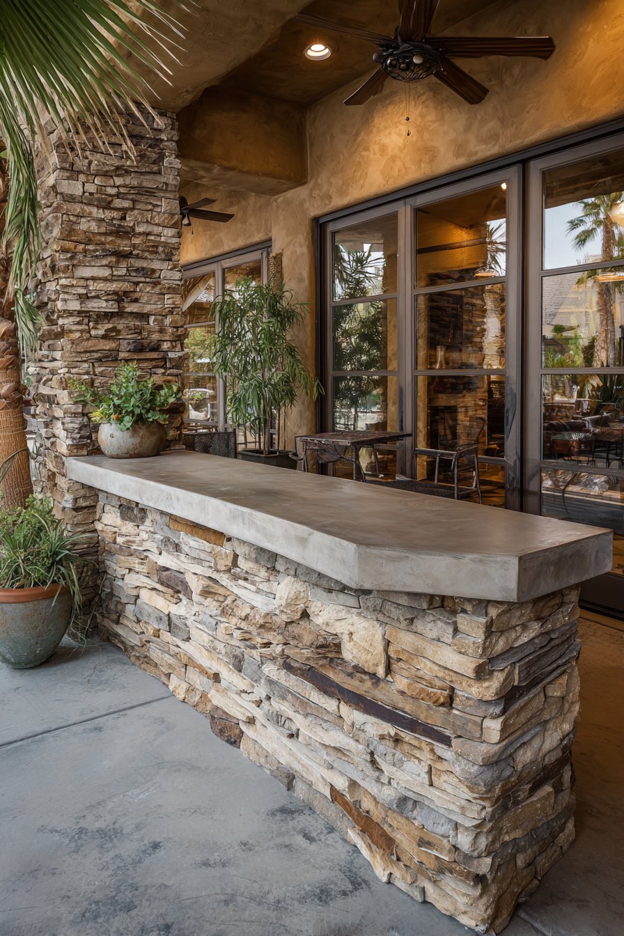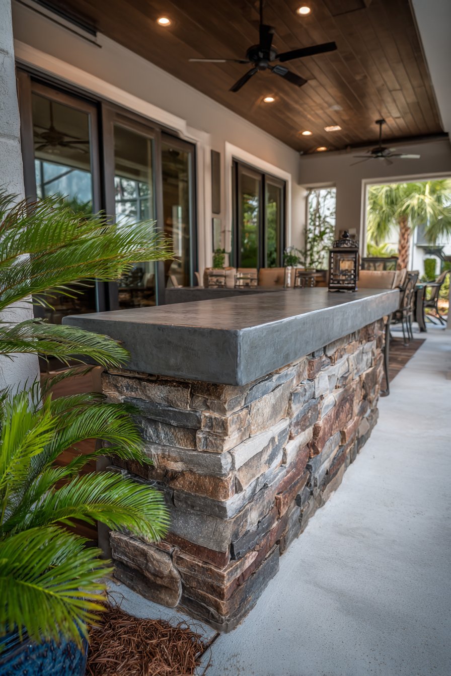 The smooth concrete cap in charcoal finish provides clean contrast to the rough stone texture below while offering a practical surface that sheds water and resists staining—important considerations in indoor-outdoor transition zones. Tropical plants flanking both sides of the partition introduce lush greenery that reinforces the connection to nature while ceiling fans circulate air, maintaining comfort in the warm climate. Large sliding glass doors visible beyond the partition blur indoor-outdoor boundaries even further, creating seamless transitions between climate-controlled interior spaces and screened outdoor living areas.