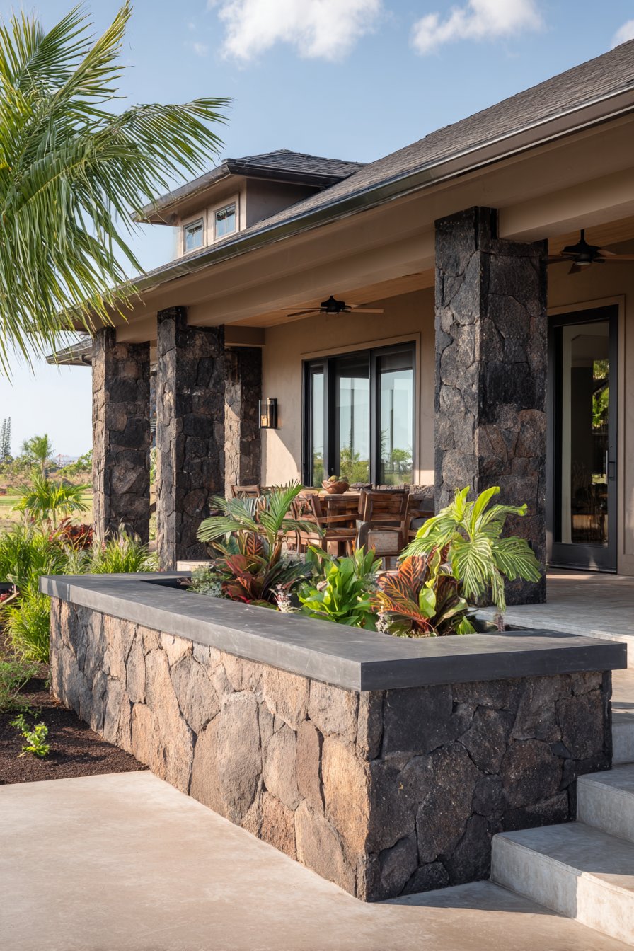 Wide-angle photography captures the resort-style ambiance and natural material richness that makes tropical design so appealing, particularly to those living in warm climates or seeking to bring vacation-style relaxation into everyday life. The varied stone textures create visual depth that changes throughout the day as shifting light emphasizes different surfaces and casts evolving shadow patterns. This approach to half wall design demonstrates how natural materials and thoughtful positioning can create architecture that feels rooted in place and climate rather than imported from incompatible design traditions.