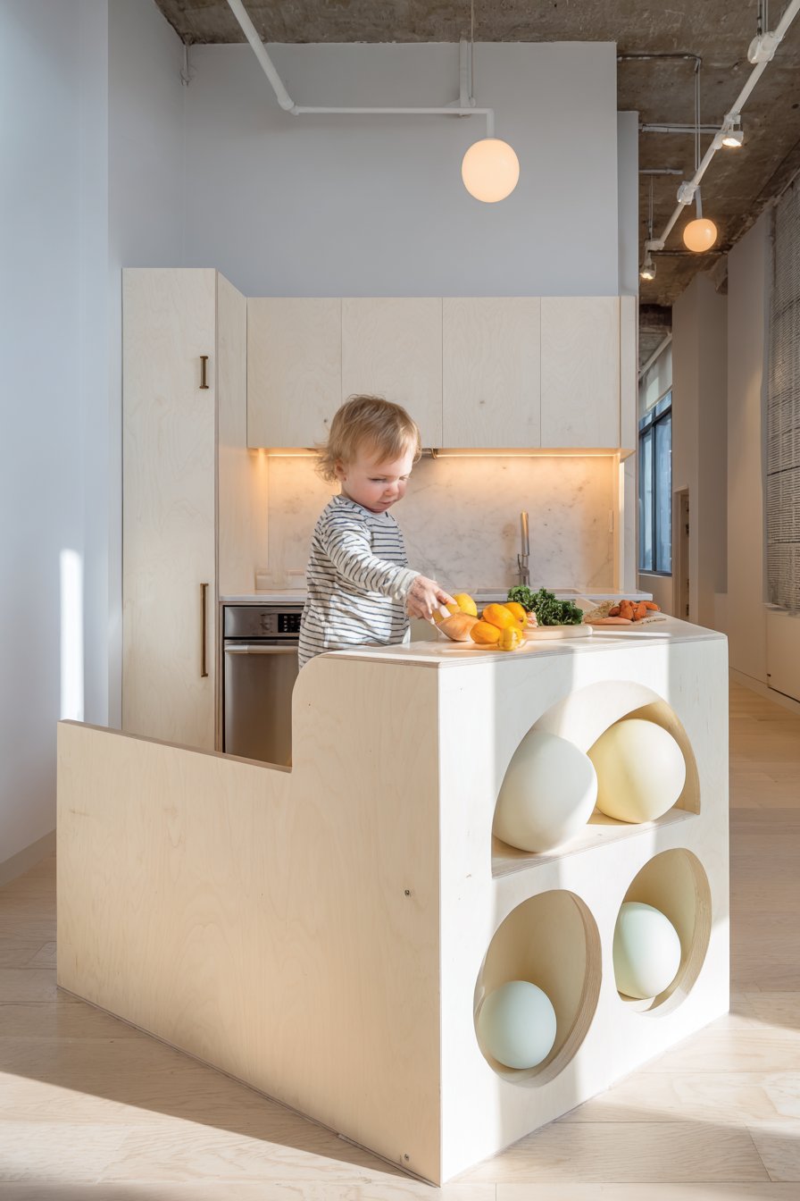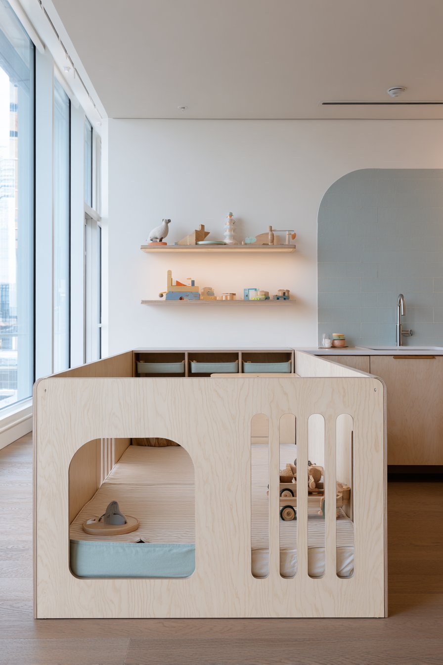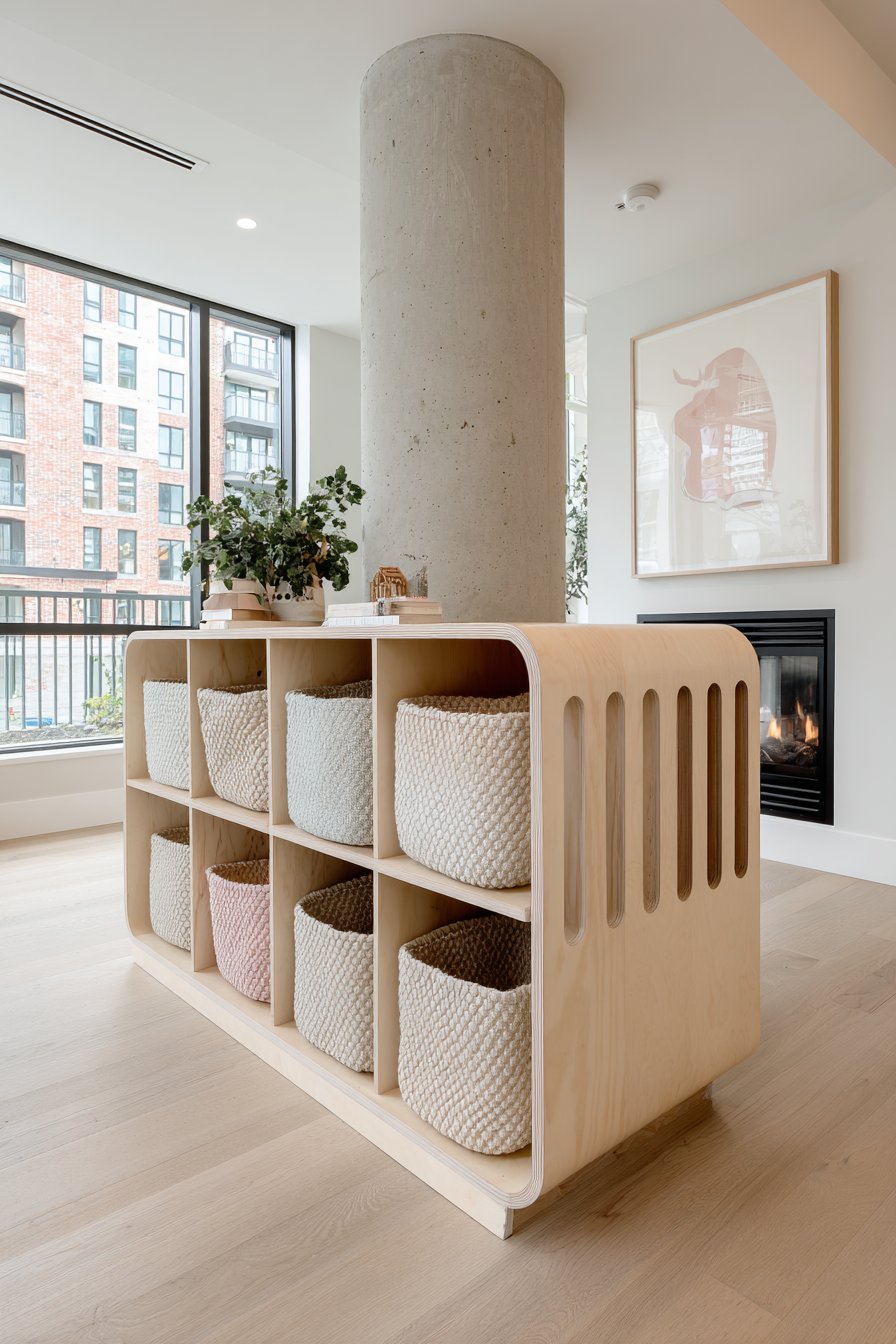 Child-friendly spaces require special design considerations that balance safety, functionality, and aesthetics while creating environments that support play and development. This Scandinavian-inspired half wall emphasizes light wood tones and functional simplicity through birch plywood construction with visible edge grain creating natural striped patterns. Separating a children’s play area from the main living space, the partition stands 36 inches tall—low enough for parental sight lines while high enough to create distinct zones. Rounded corners throughout ensure safety, eliminating sharp edges that pose hazards in active play environments.