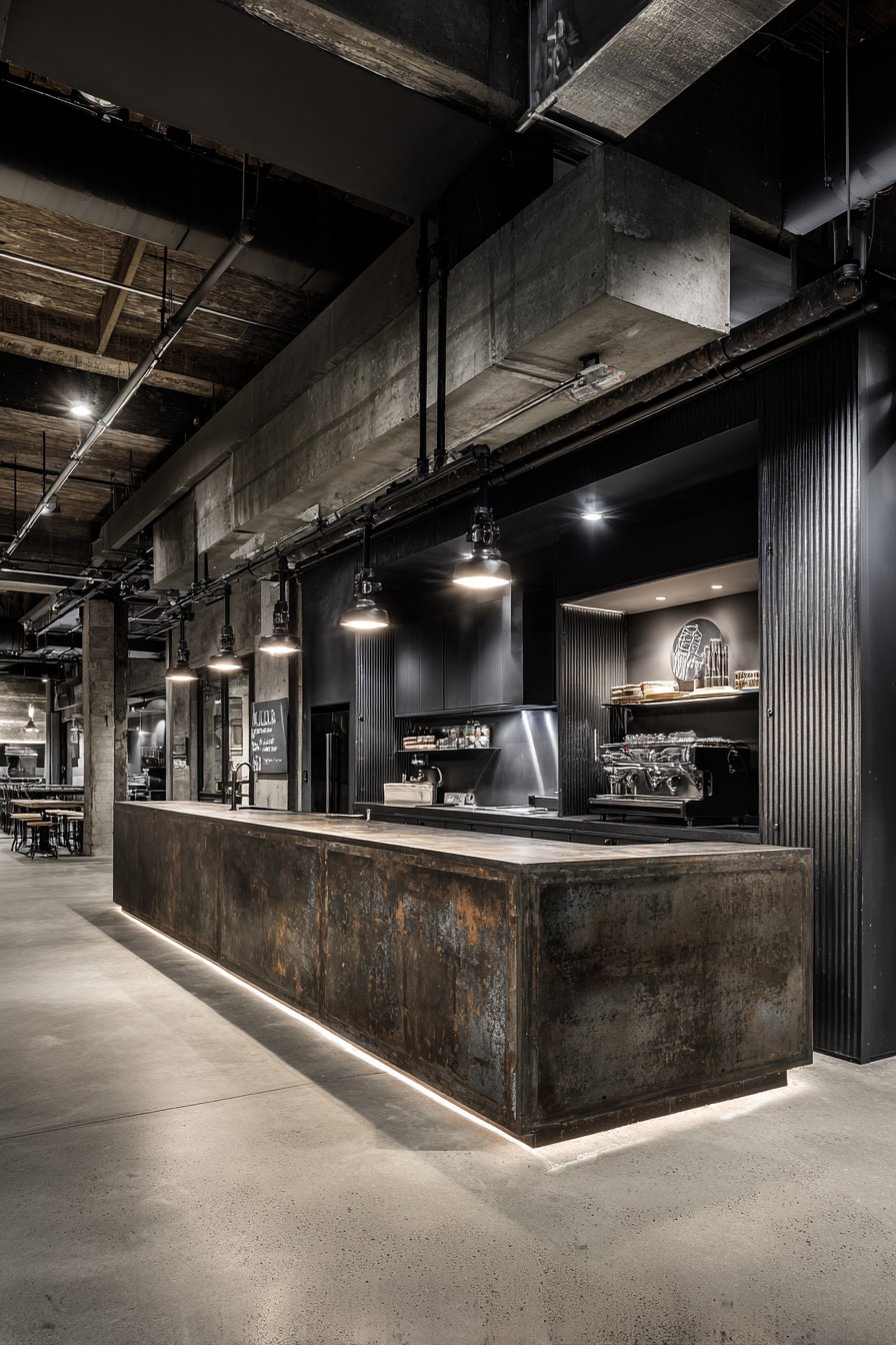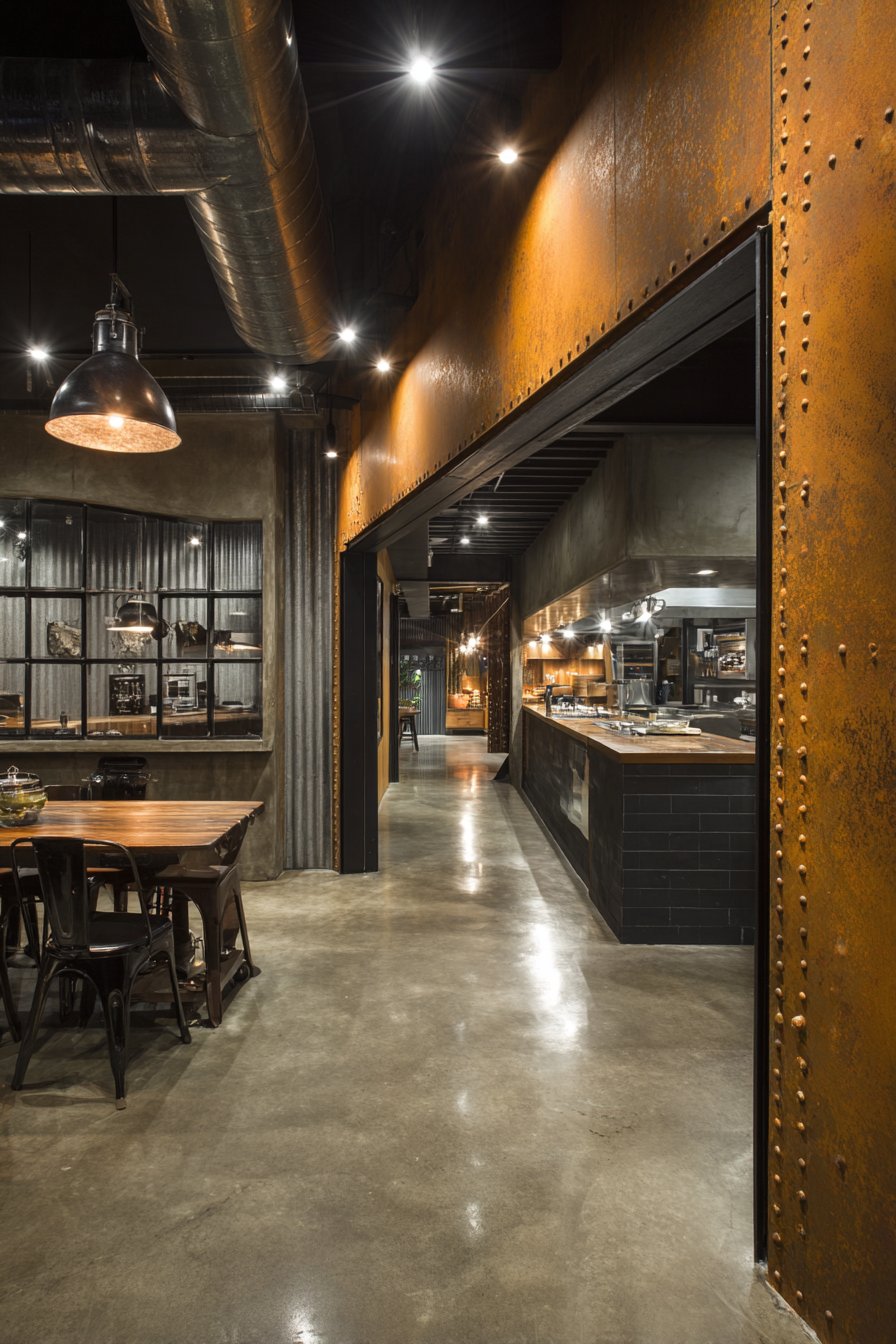 Steel pipe framework supports the structure with visible welds that serve as honest expressions of construction method rather than defects to be hidden. This celebration of industrial joinery and structural elements represents the core philosophy of industrial design—finding beauty in utility and honoring the materials and methods of manufacturing and construction. Concrete flooring and exposed ductwork visible overhead enhance the raw aesthetic, creating a cohesive industrial environment where each element reinforces the urban loft character.