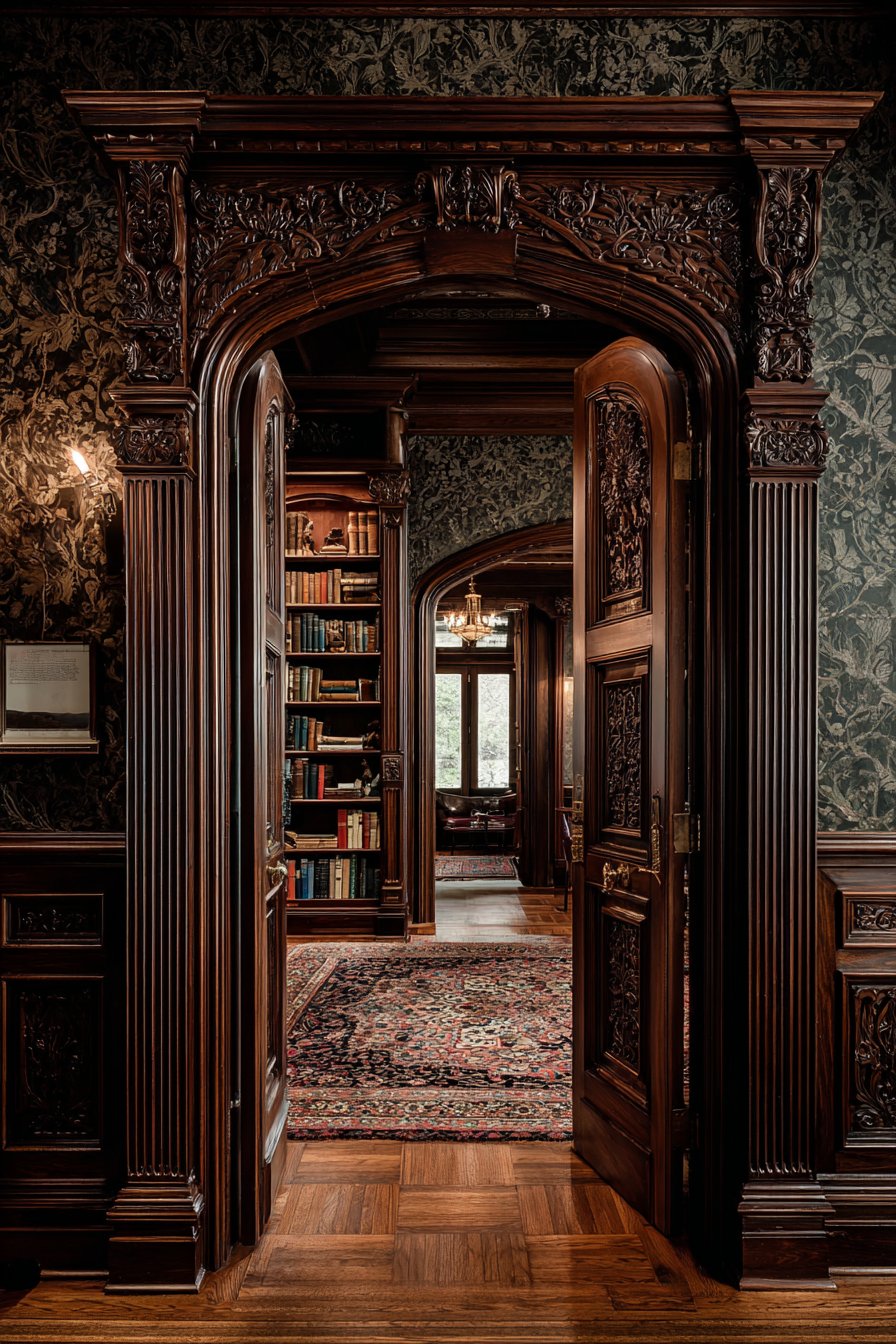Deep jewel-tone wallpaper visible in the library beyond—perhaps ruby red damask or forest green botanical patterns—complements the dark wood while introducing pattern and color appropriate to Victorian interiors. Persian rugs in similar rich colors and ornate patterns complete the elegant setting, their wool pile adding warmth and luxury underfoot while their intricate designs provide additional layers of visual interest. Period furnishings including tufted leather seating and carved occasional tables reinforce the historical authenticity and create cohesive Victorian ambiance throughout both adjacent spaces.
