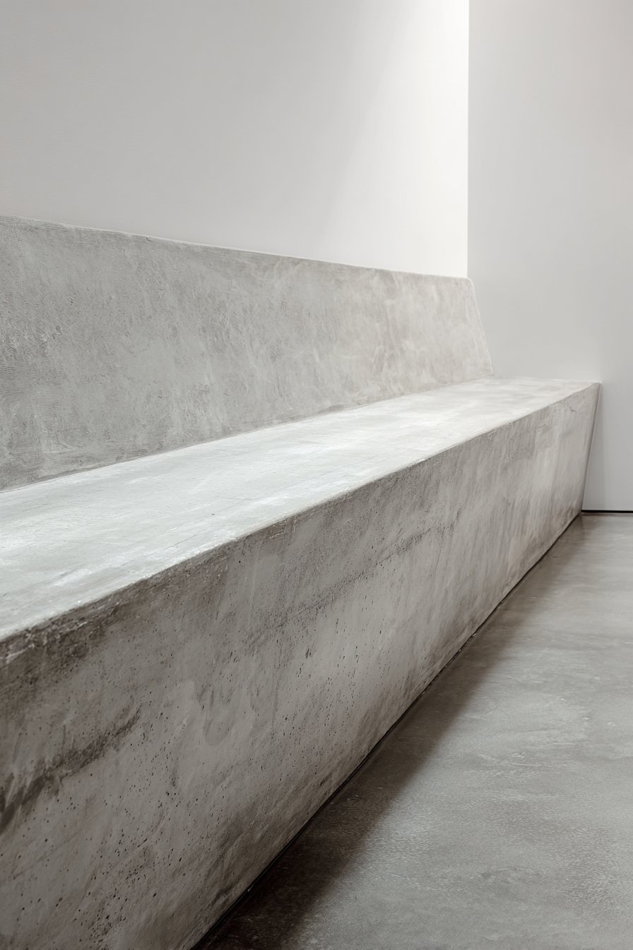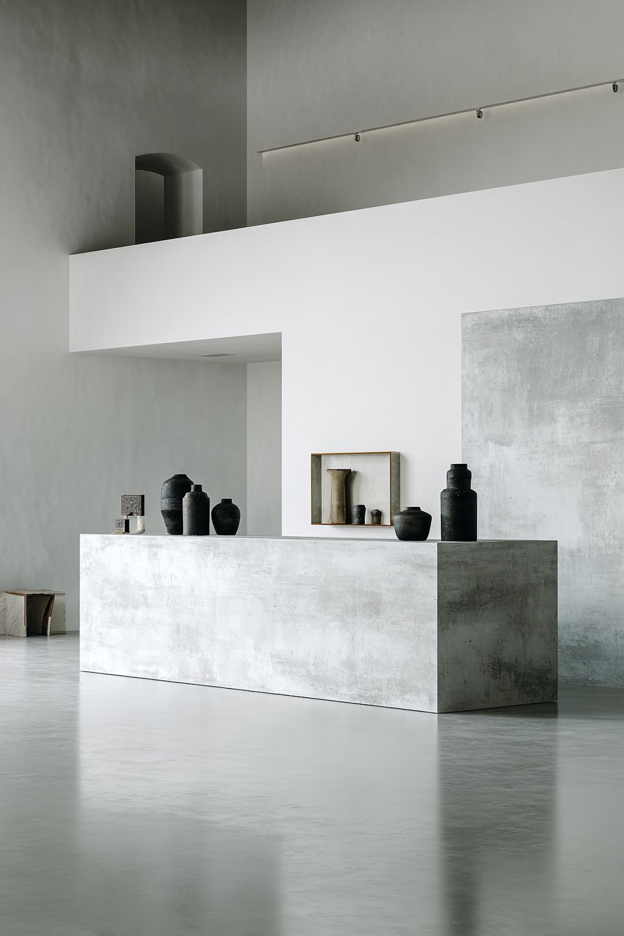 The concrete serves dual purposes—acting as a room divider while providing a display ledge for carefully selected sculptural objects that enhance rather than detract from the concrete’s minimalist beauty. This integration of functional display space demonstrates how good design can layer multiple purposes into single elements, maximizing utility while maintaining aesthetic clarity. Polished concrete floors extending throughout create material continuity while their reflective surface adds subtle visual interest without introducing pattern or color that would complicate the minimal palette. White walls surrounding the partition emphasize the architectural statement, providing neutral backdrop that allows the concrete form to command full attention.
