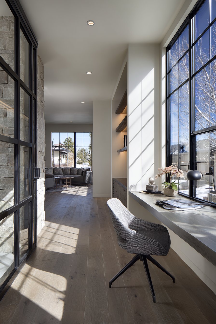 The contemporary home office demands design solutions that provide privacy and focus while maintaining the visual openness that prevents workspaces from feeling isolated or claustrophobic. This innovative half wall design achieves that delicate balance through the strategic use of glass panels set within sleek black metal framing, creating a transparent boundary that defines the workspace without cutting it off from the rest of the living area. The industrial-inspired metal framework provides structural support while adding bold linear elements that contribute to the modern aesthetic. The transparency of the glass allows natural light to penetrate throughout the space while still establishing a clear psychological boundary between work and leisure zones.