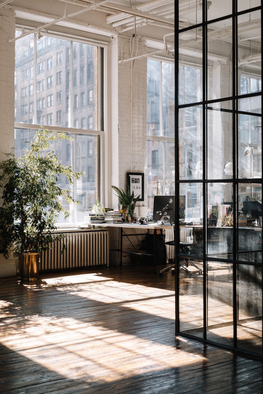 Large windows flooding the space with natural light create interesting shadow patterns through the glass panels, adding dynamic visual interest that changes throughout the day as the sun moves across the sky. This interplay of light and shadow prevents the workspace from feeling static or monotonous, instead creating an environment that feels alive and connected to the natural world outside. The balanced exposure achieved through professional photography techniques showcases how the modern industrial aesthetic can feel warm and inviting rather than cold or institutional when executed with attention to material quality and spatial relationships.