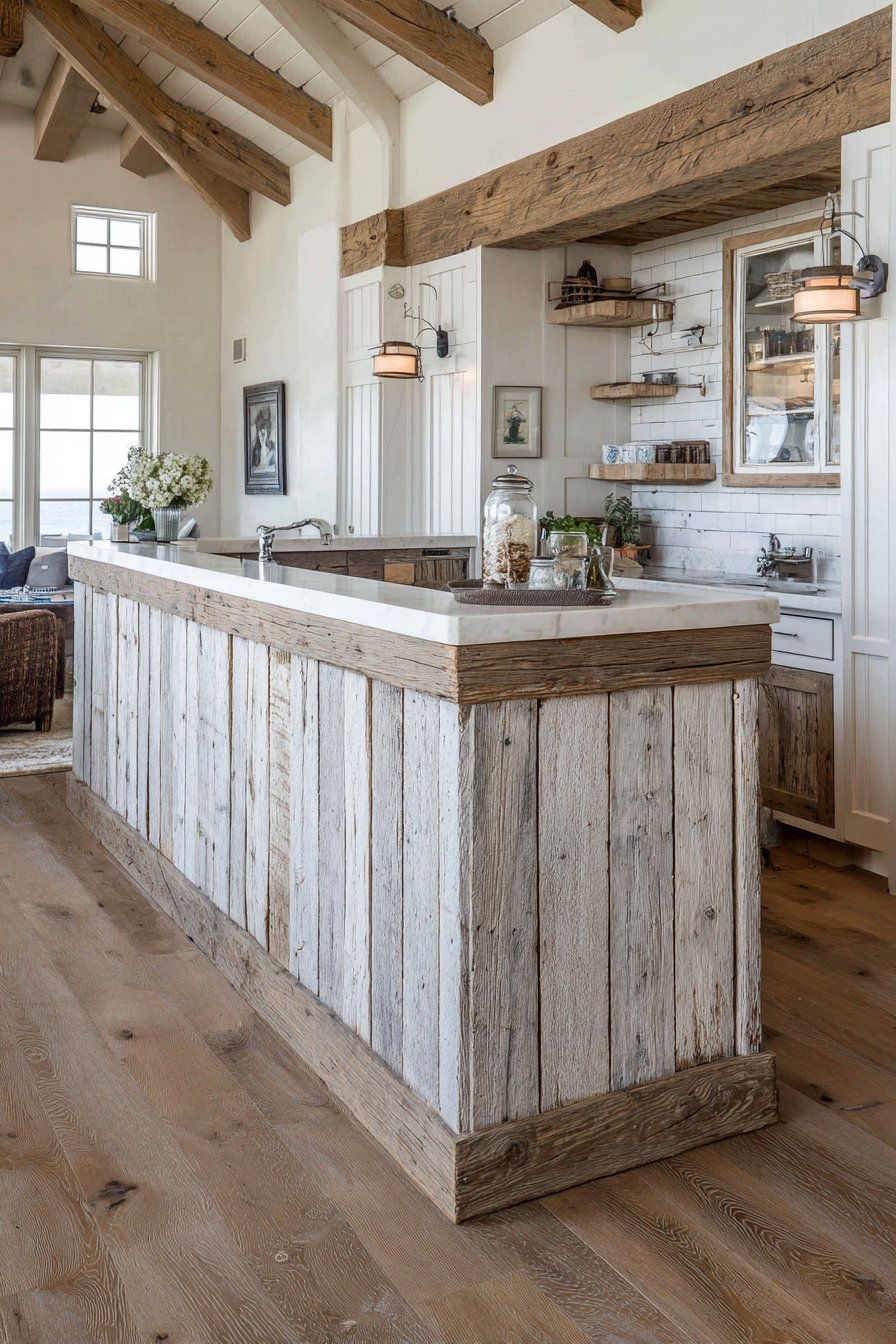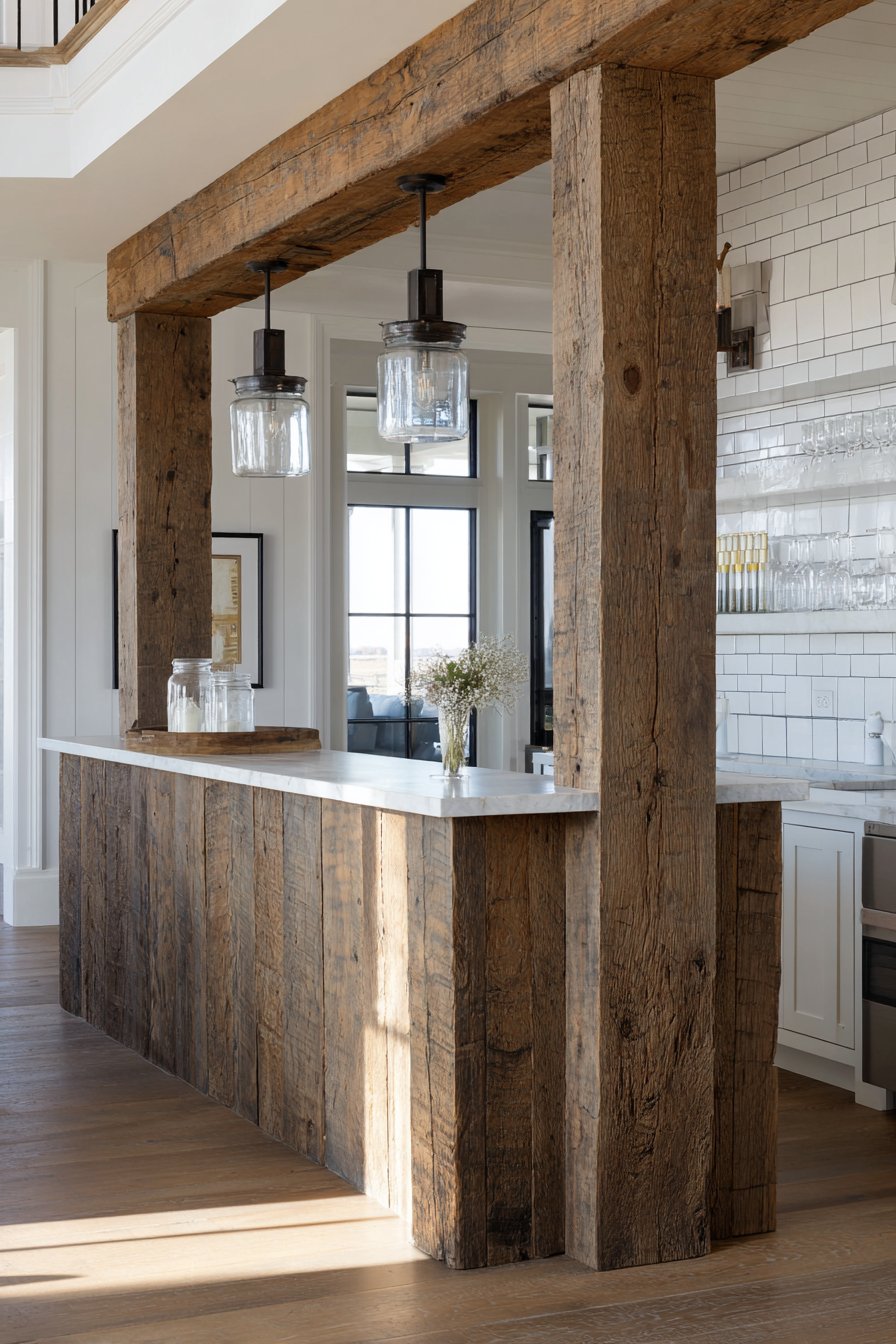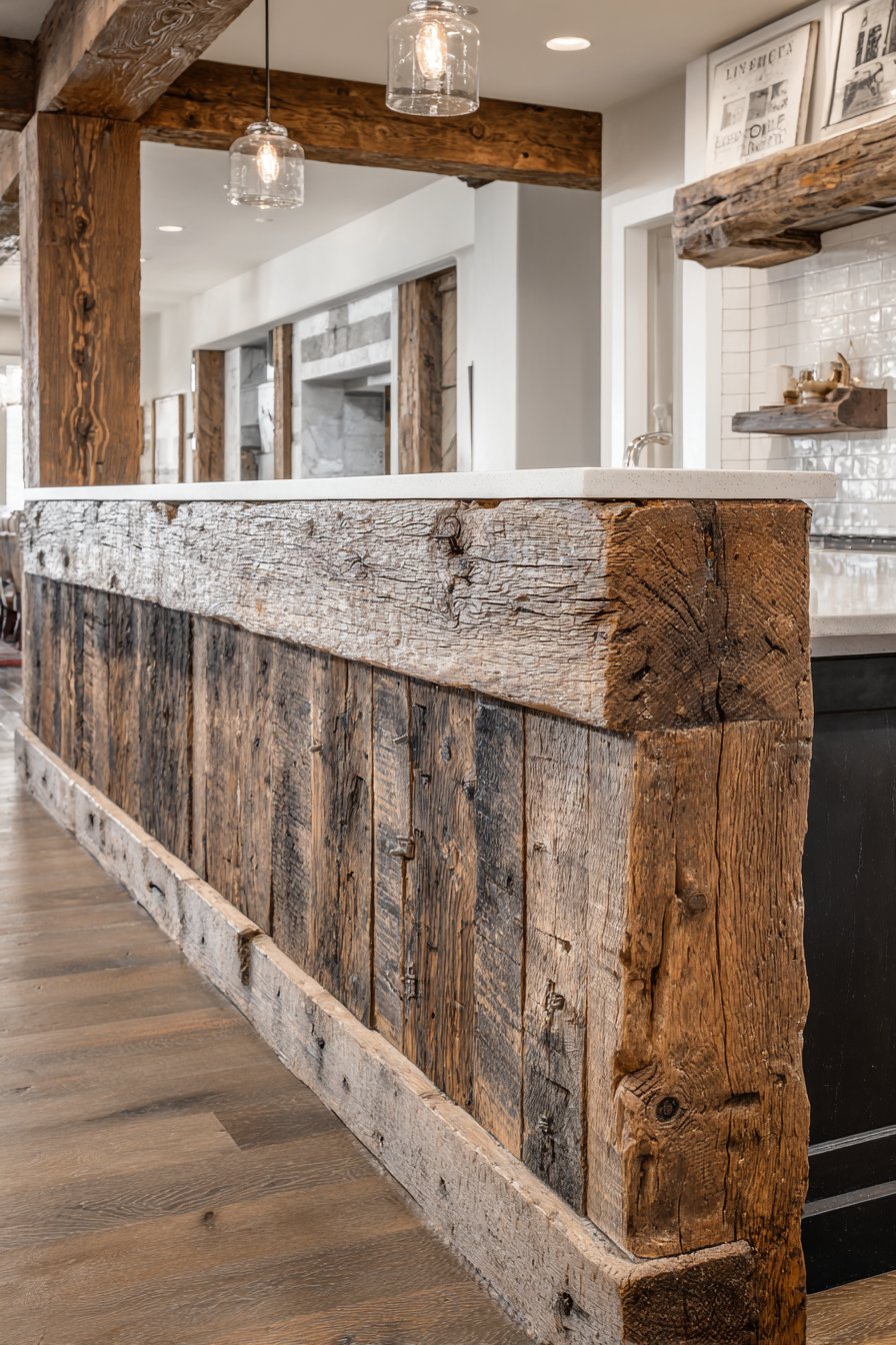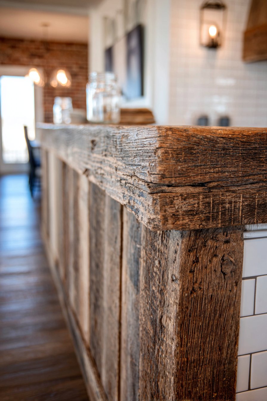 The authentic aged wood texture creates a striking contrast with the clean, white subway tile backsplash visible in the kitchen beyond, demonstrating how rustic elements can coexist beautifully with more contemporary finishes. This juxtaposition prevents the rustic aesthetic from feeling too theme-heavy or contrived, instead creating a layered, collected look that suggests the home has evolved organically over time. Mason jar sconces mounted on the kitchen side serve double duty as both practical lighting sources and charming decorative accents that reinforce the farmhouse theme without resorting to clichéd or overly cutesy elements.