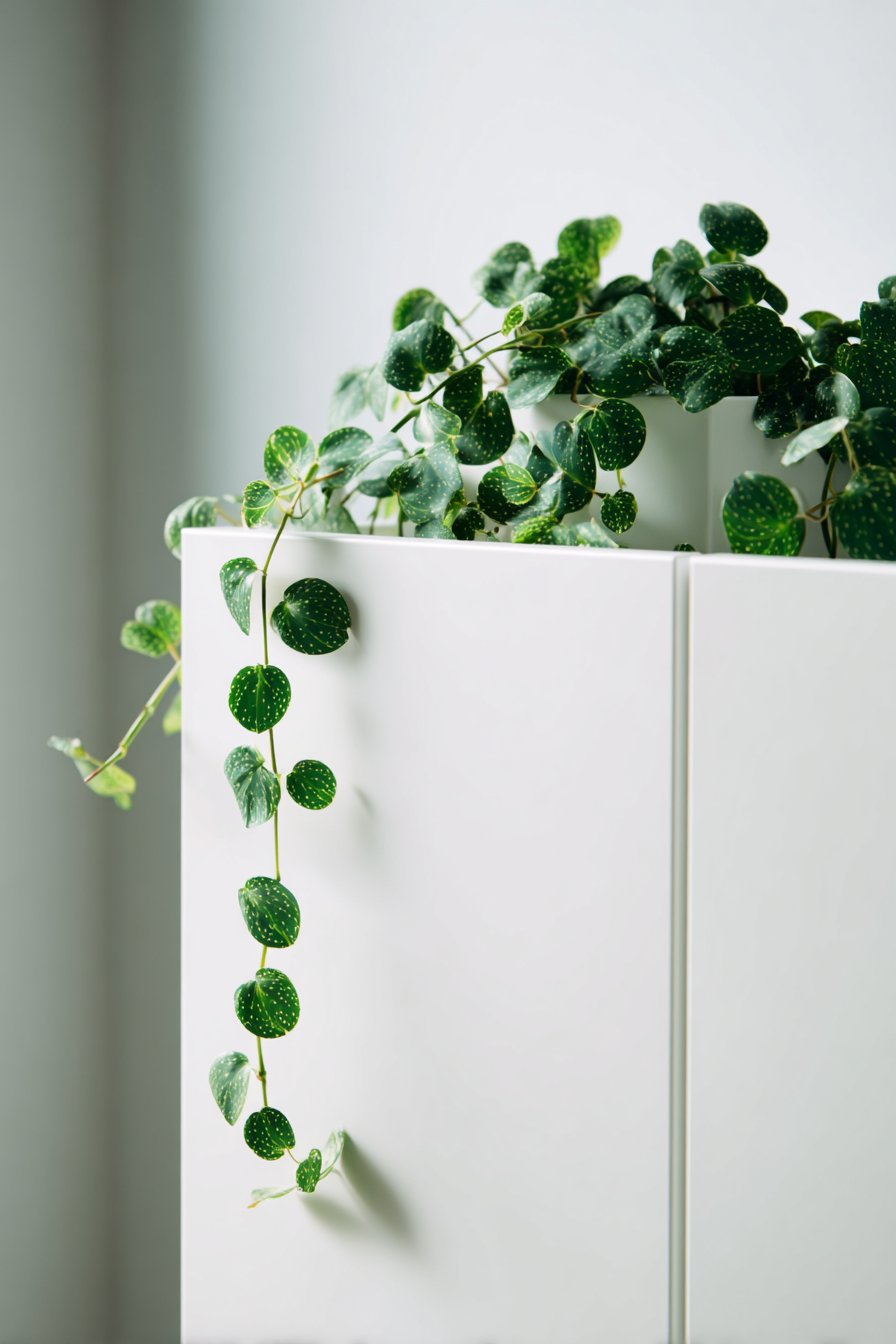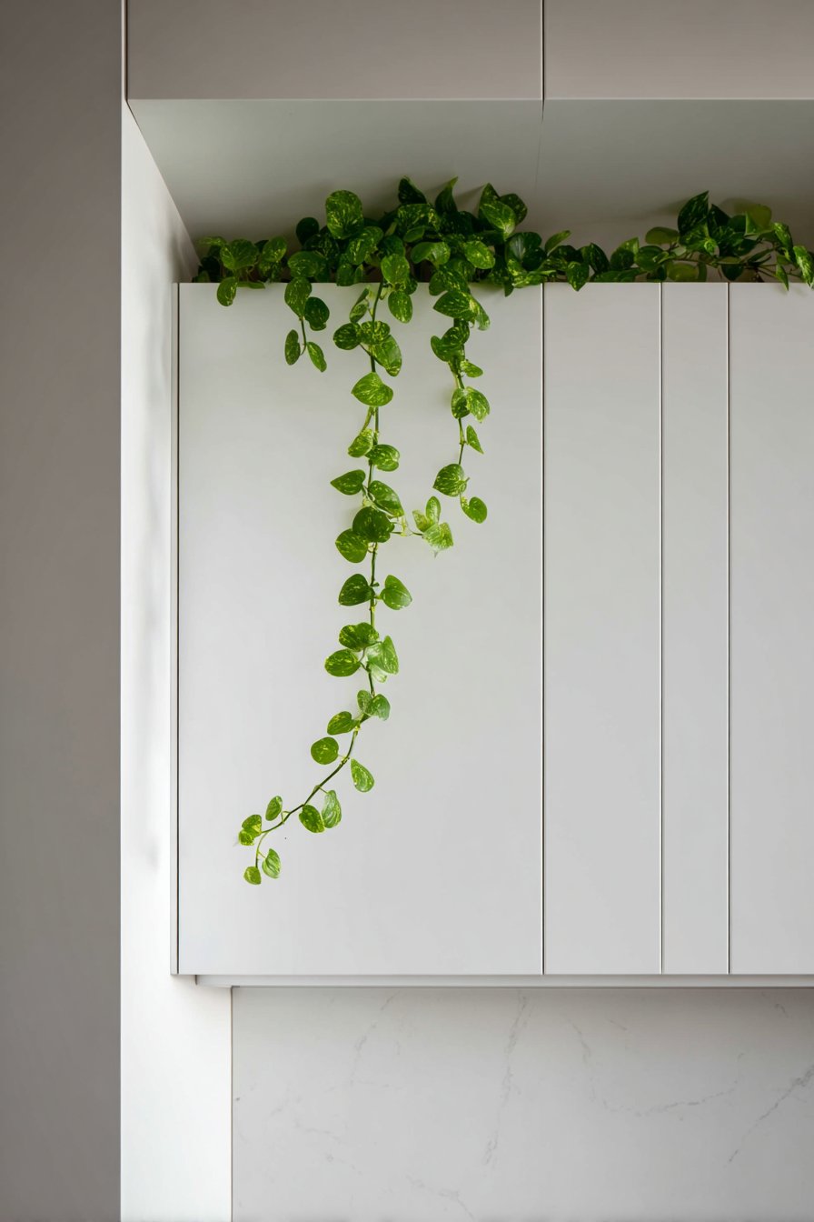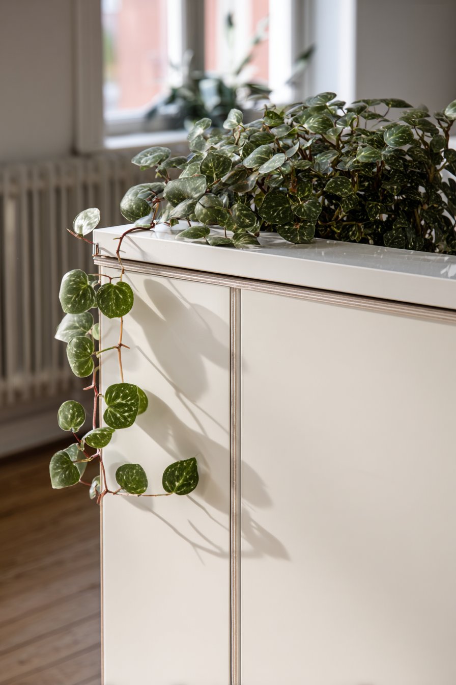 A single trailing pothos plant draped naturally over the cap rail introduces the only organic element in this otherwise minimal composition, its living green presence providing just enough visual softness to prevent the stark white surfaces from feeling cold or clinical. Professional interior photography utilizing soft Nordic lighting—that characteristic diffused, even illumination that seems to emanate from everywhere and nowhere simultaneously—showcases the pure geometric form and demonstrates how functional simplicity can achieve a level of beauty that ornate decoration often cannot match.
