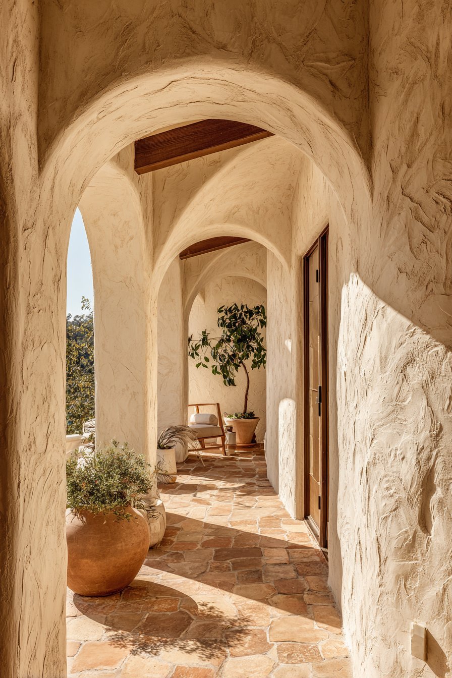 Natural afternoon light streaming through the arches creates constantly changing shadow patterns on the stucco surfaces, adding dynamic visual interest that transforms throughout the day. The subtle texture variations inherent in hand-applied stucco finishes catch and reflect light differently across the surface, creating depth and dimension that flat painted walls cannot achieve. Interior design photography captures this romantic architectural detail and the warm, inviting atmosphere that Mediterranean design principles naturally create, demonstrating how traditional building techniques and materials can feel fresh and relevant in contemporary applications.