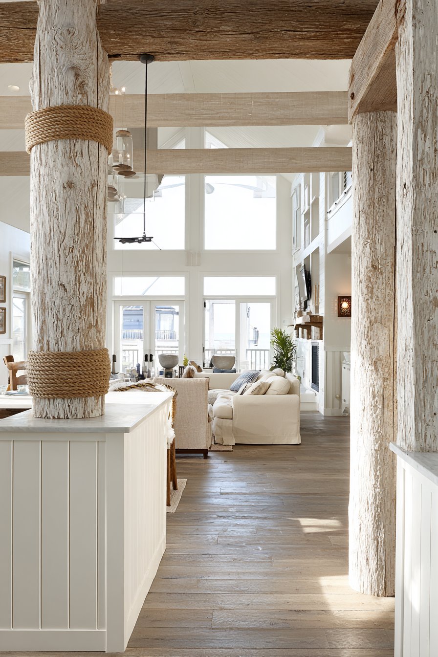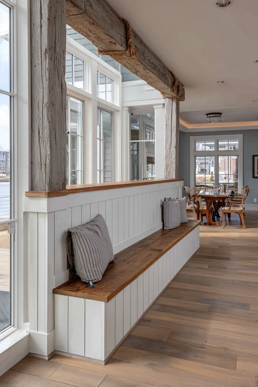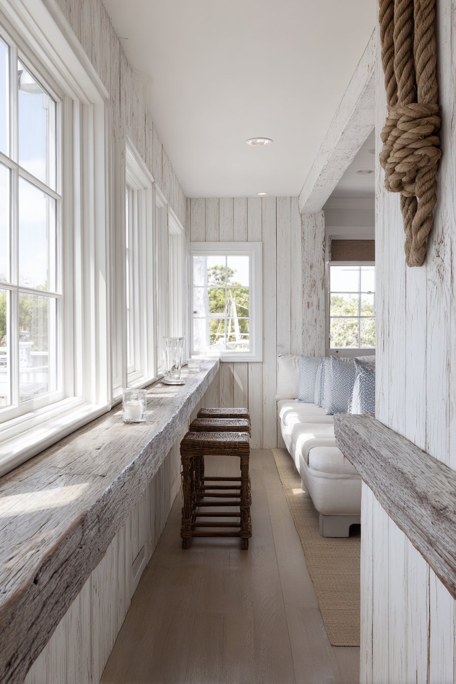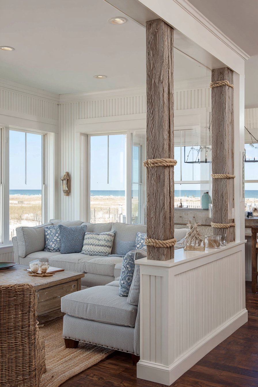 Large windows beyond the half wall flood both adjacent spaces with brilliant natural light, creating the sun-drenched, optimistic atmosphere that makes coastal homes so appealing. The casual, breezy aesthetic emerges not from any single element but from the thoughtful combination of white-painted surfaces, natural wood accents, nautical-inspired details, and abundant sunshine. Wide-angle interior photography emphasizes the texture details created by the tongue-and-groove installation while capturing the relaxed coastal vibe that invites you to kick off your shoes, settle in, and let the cares of the world drift away with the tide.