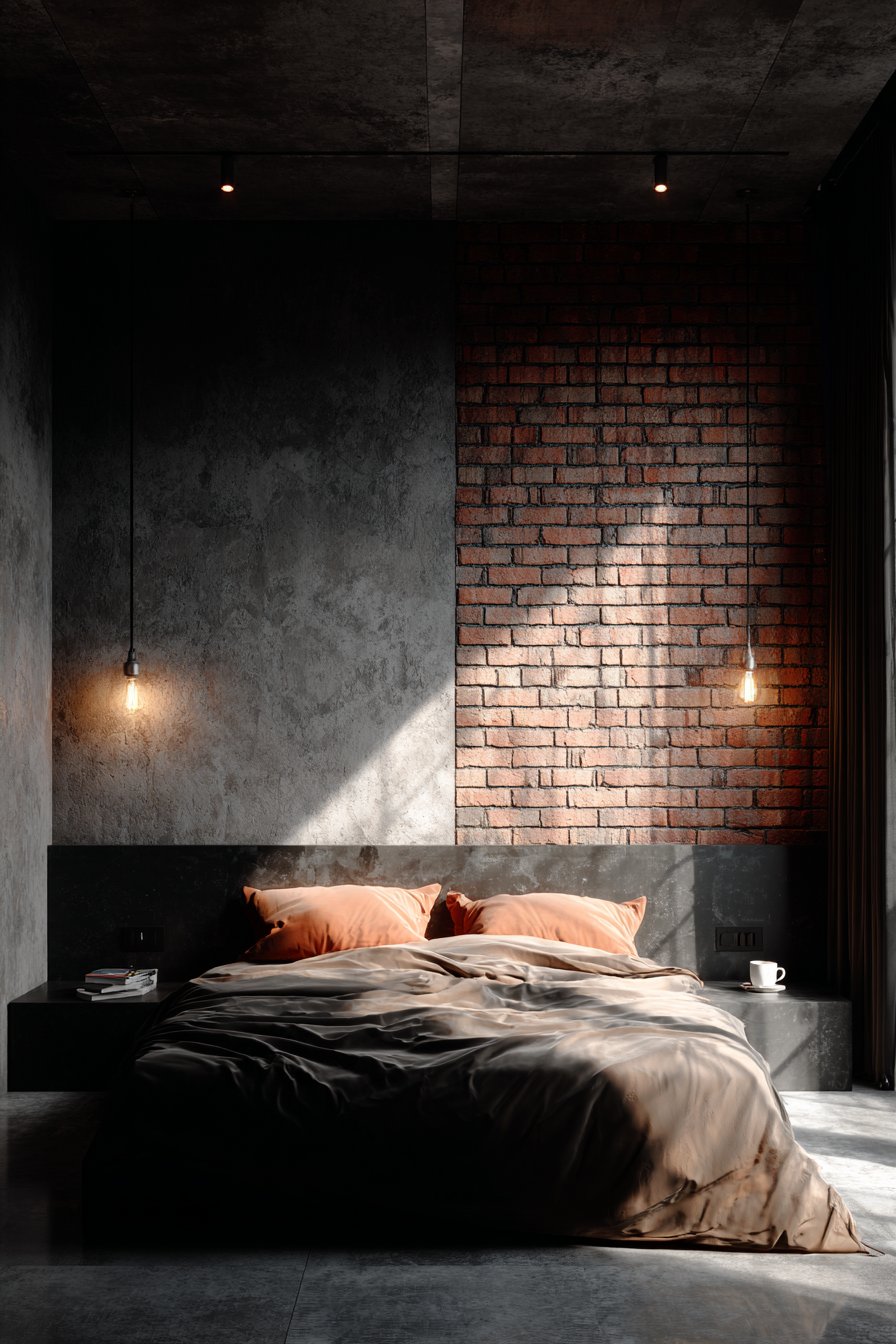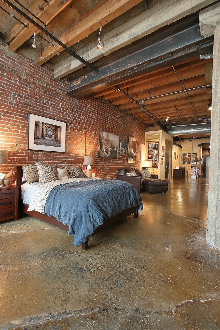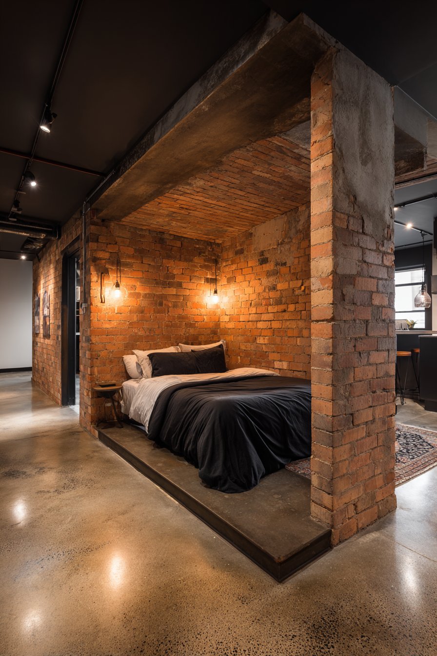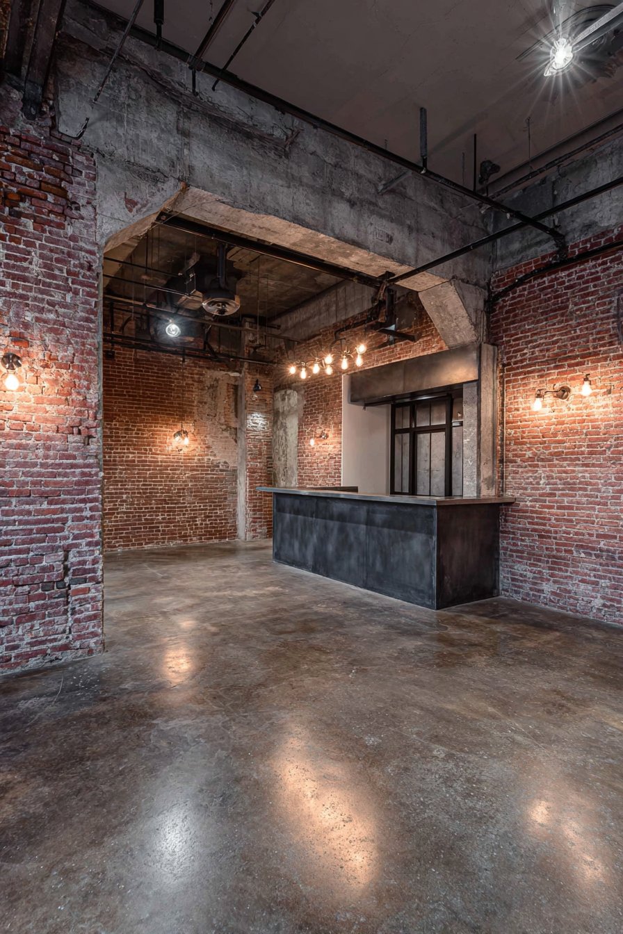 Edison bulb wall sconces mounted directly on the brick surface provide ambient lighting while reinforcing the vintage industrial aesthetic—these early incandescent designs with their visible filaments represent the marriage of utility and beauty that defines the best industrial design. The warm glow from these fixtures creates dramatic contrast against the dark brick surfaces, highlighting texture and creating pools of golden light that soften the potentially harsh materials. Polished concrete flooring extending throughout the space complements the brick walls perfectly, both materials sharing an honest, utilitarian character that refuses to apologize for its industrial origins.