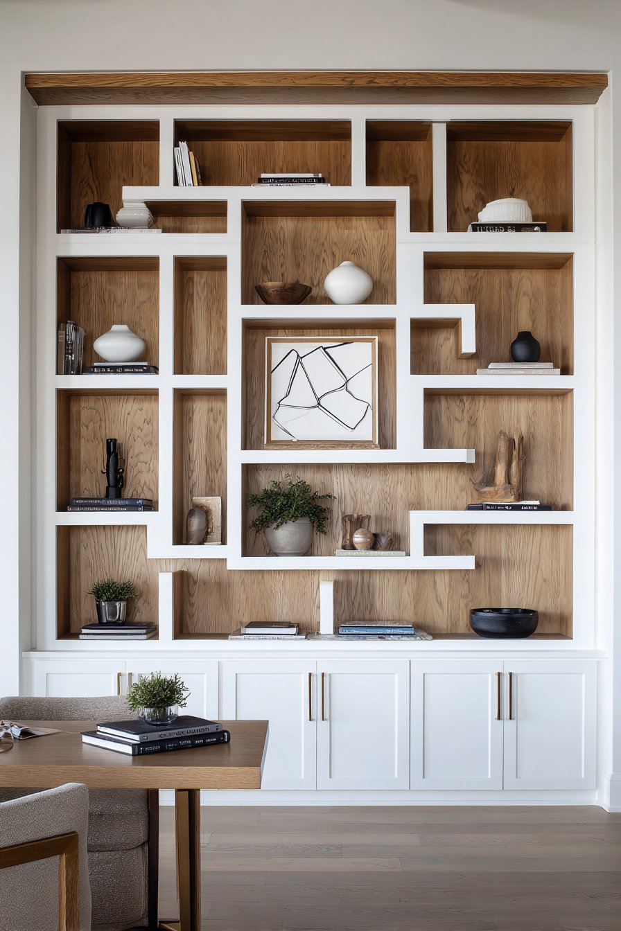 Natural wood backing within each cubby creates warm contrast against the white frame while adding depth and visual interest to the open storage sections. This thoughtful detail prevents the cubbies from appearing as mere holes in the wall, instead creating finished, intentional spaces that showcase displayed items to their best advantage. The top rail finished in matching wood provides visual continuity and ties the natural wood elements together into a cohesive composition. The careful balance between white painted surfaces and natural wood tones creates a transitional aesthetic that works beautifully in both traditional and contemporary settings.