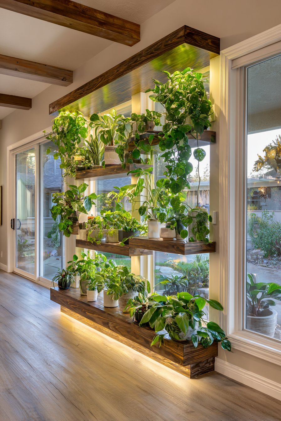 - Install subtle LED accent lighting beneath shelves to illuminate plants during evening viewing