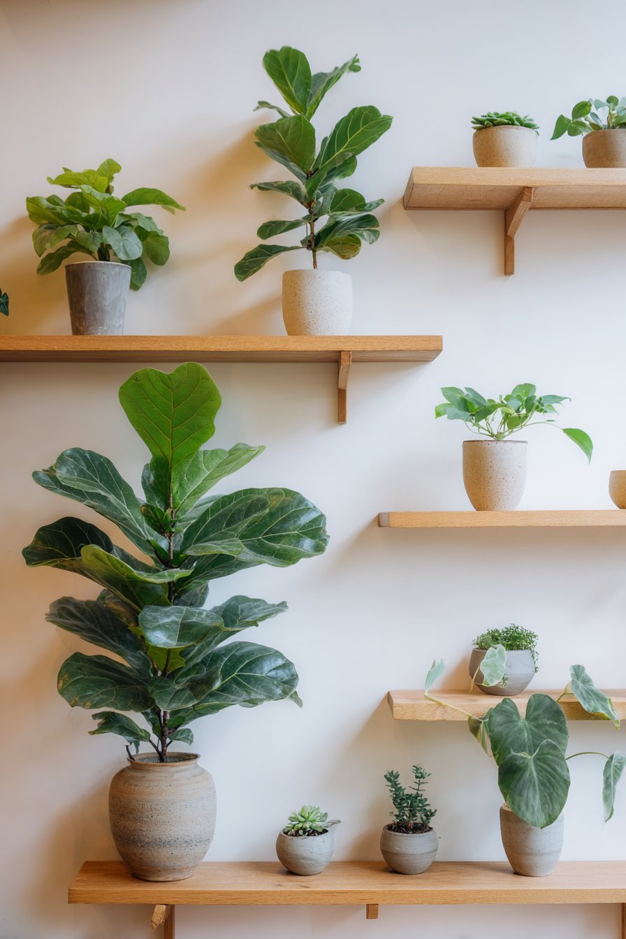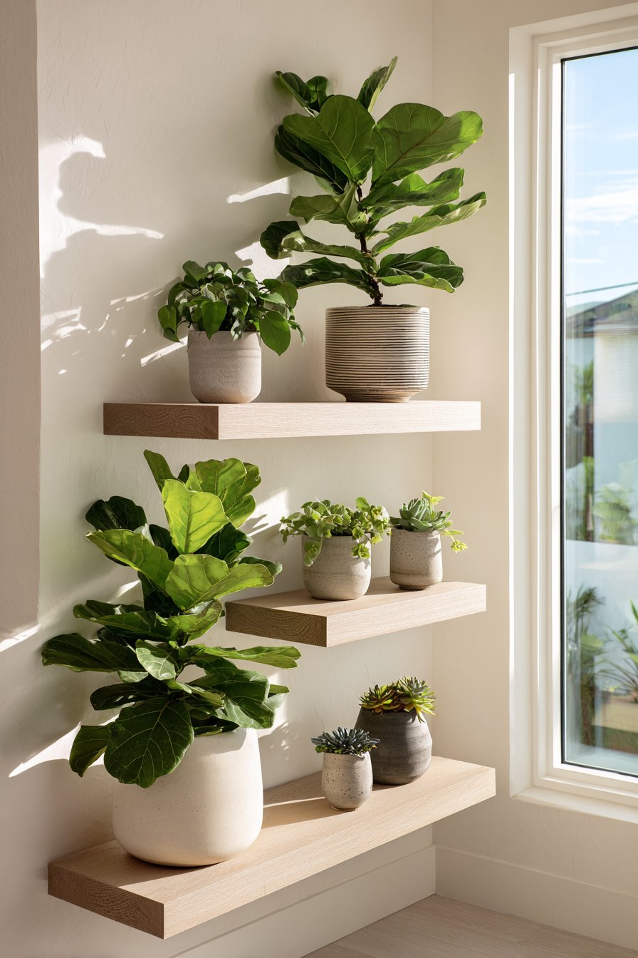 The epitome of Scandinavian simplicity, a three-tier floating shelf system in light oak wood creates a serene plant display that emphasizes clean lines and thoughtful curation. Mounted against a pristine white wall, these shelves seem to defy gravity, creating an illusion of lightness that perfectly complements the airy aesthetic. Each shelf holds carefully selected plants—a statuesque fiddle leaf fig commanding attention on the middle tier, trailing pothos cascading gracefully from ceramic planters, and clusters of small succulents in concrete pots adding textural variety. The natural morning light streaming from a nearby window doesn’t just illuminate the display; it becomes an integral part of the design, casting soft shadows that highlight the organic shapes of leaves and the subtle grain patterns in the oak wood.