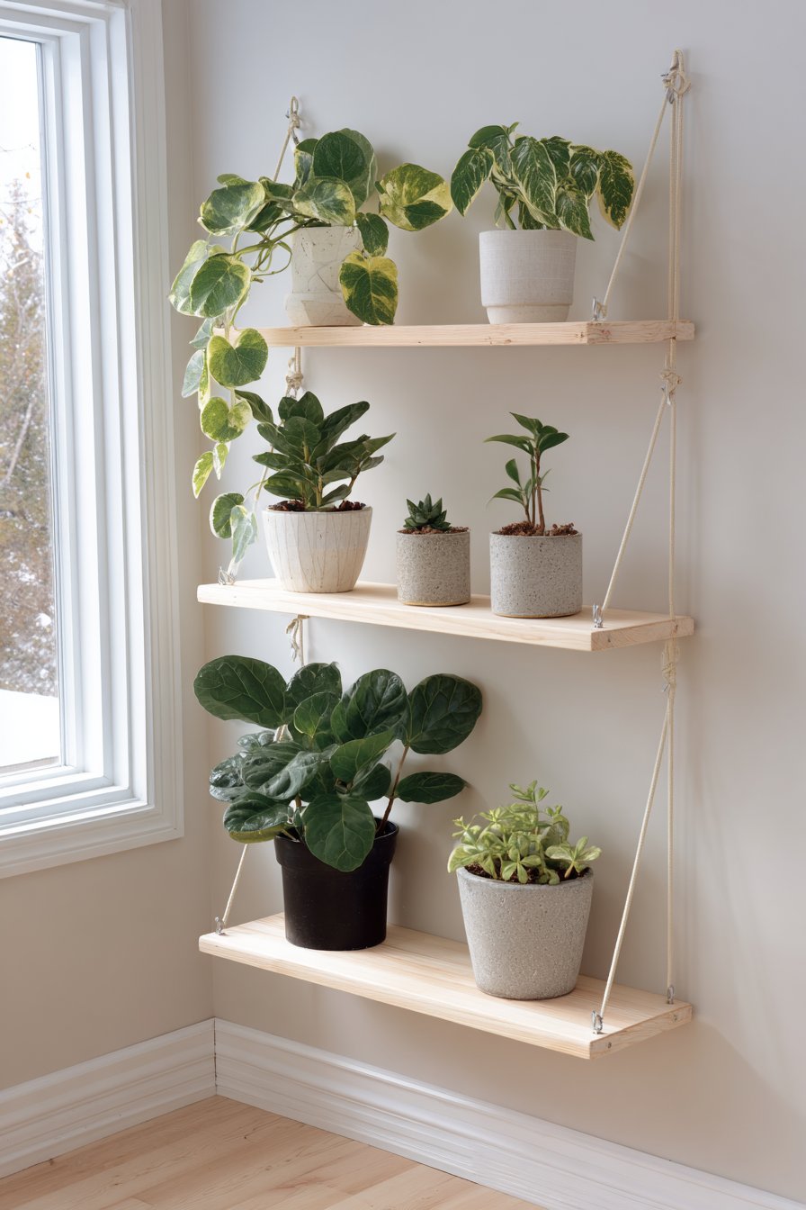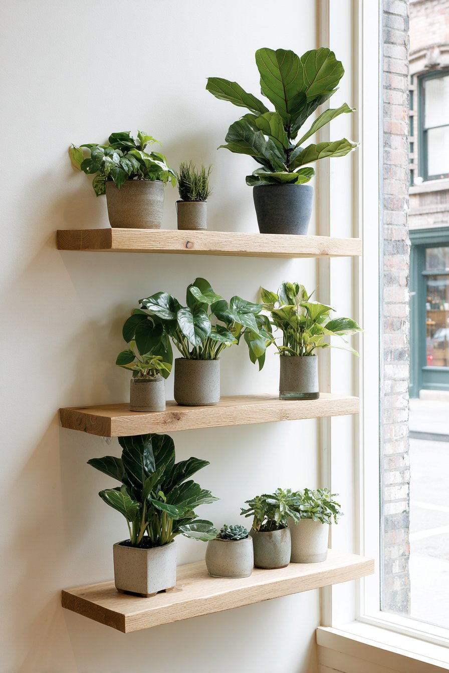 What makes this indoor plant shelf idea particularly effective is its restraint. Rather than overwhelming the space with excessive greenery, this arrangement demonstrates the power of careful editing. The spacing between shelves allows each plant adequate room to breathe and grow, while the consistent material palette of wood, ceramic, and concrete creates visual harmony. The varied heights and forms of the plants—upright, trailing, and clustered—provide visual interest without chaos, proving that minimalism doesn’t mean boring.