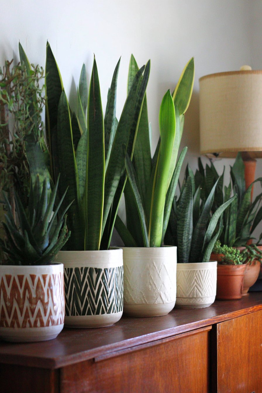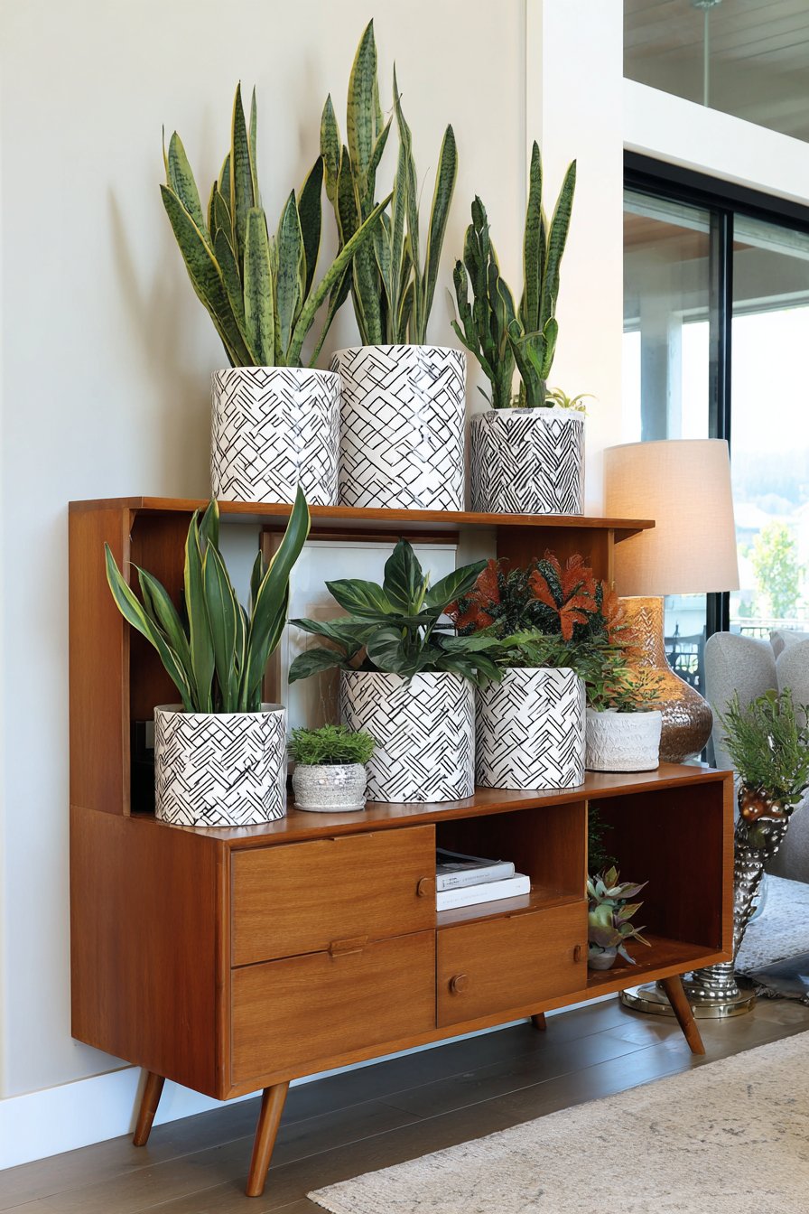 - Choose planters with period-appropriate aesthetics: geometric patterns, tapered forms, atomic-age designs
