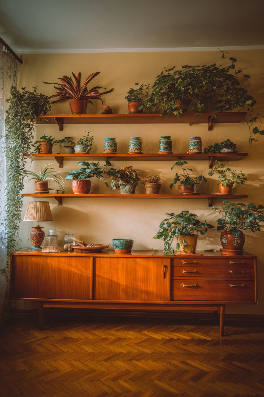 The plant selection echoes the era’s fascination with bringing tropical modernism indoors: a statuesque bird of paradise with its dramatic paddle-shaped leaves becomes a living sculpture, its scale and form perfectly suited to the clean-lined furniture. Trailing varieties like pothos and philodendron cascade from upper shelves, their organic movement providing pleasing contrast to the rigid geometry of the shelving. Planters themselves become design elements—ceramic vessels with geometric patterns, tapered forms, or distinctive glazes in period-appropriate colors like avocado green, burnt orange, or warm mustard yellow. These aren’t merely containers; they’re decorative objects that would have been at home in original mid-century interiors.