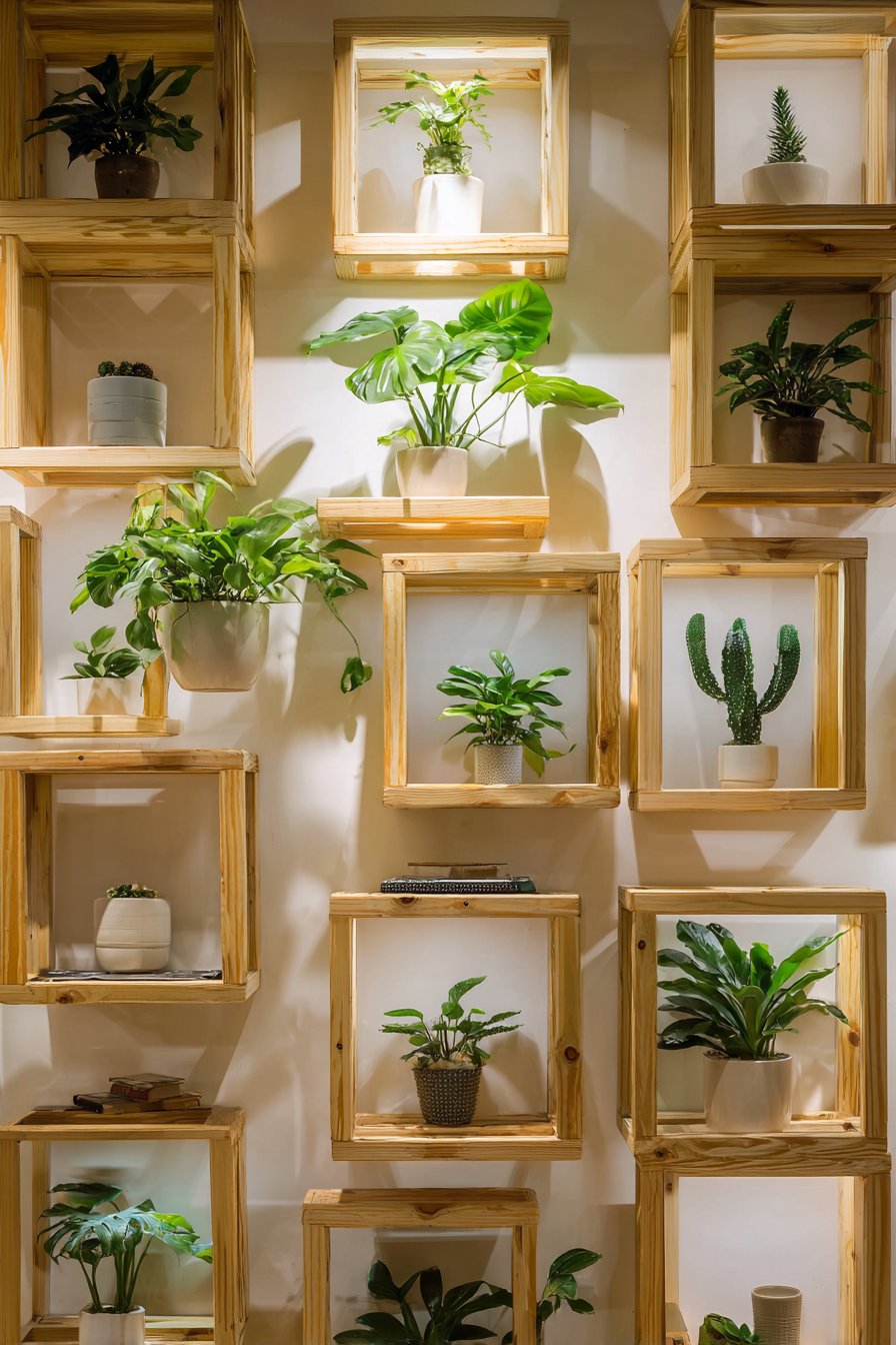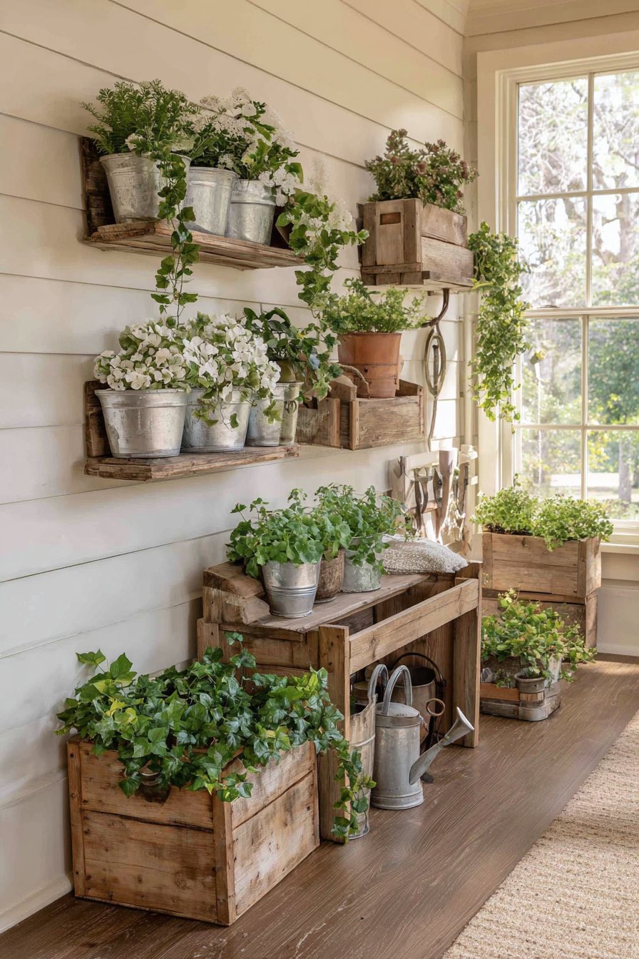 The shiplap wall provides the perfect canvas for this rustic tableau, its horizontal lines creating rhythm and texture without competing with the crates for attention. Natural wood tones dominate the palette—the honey warmth of pine crates, the weathered gray of aged cedar, the rich browns of reclaimed barn wood—creating a cohesive environment that feels both designed and effortless. This indoor plant shelf idea proves particularly popular among those embracing farmhouse, cottage, or country design styles, but its appeal extends to anyone who values sustainability, handcrafted character, and the satisfaction of creating something beautiful from materials that might otherwise have been discarded.