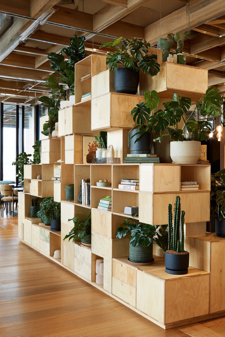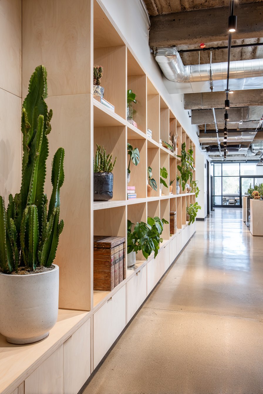 - Incorporate plants with strong architectural forms—rubber trees, monstera, snake plants—to match the bold shelving