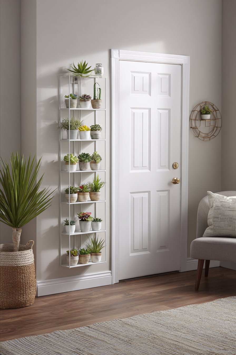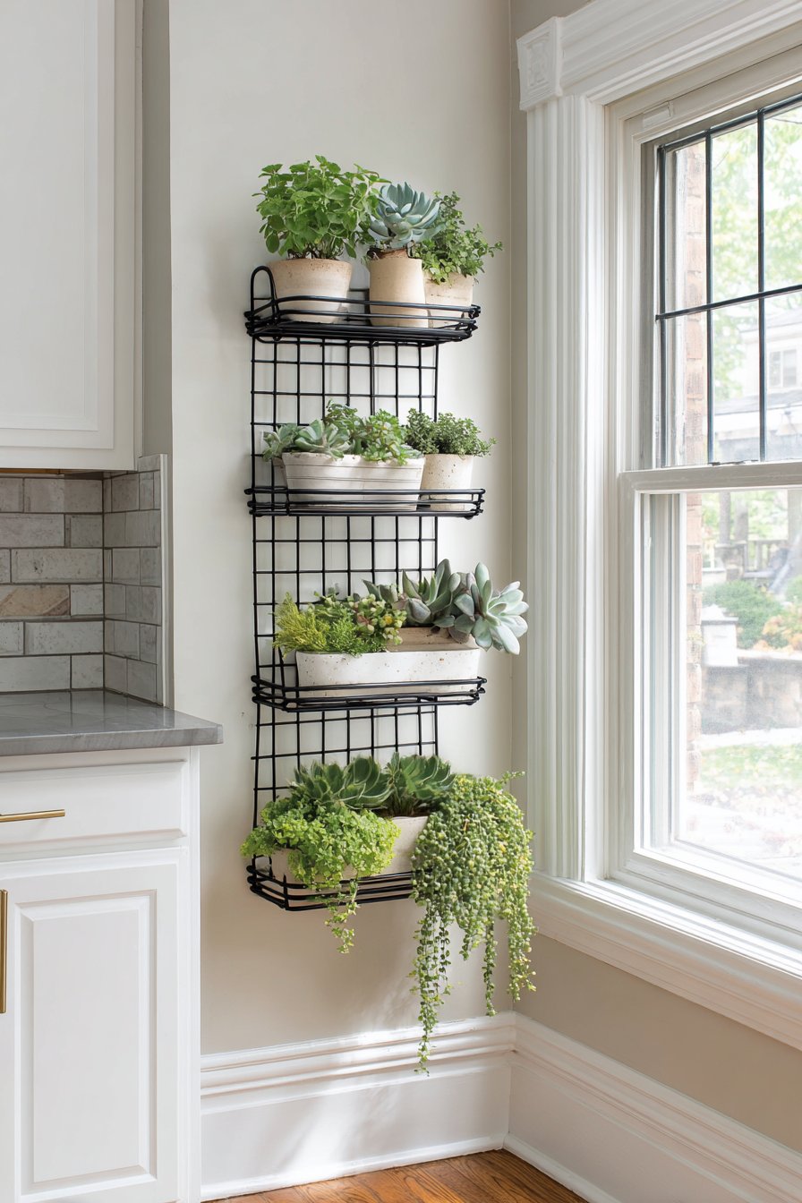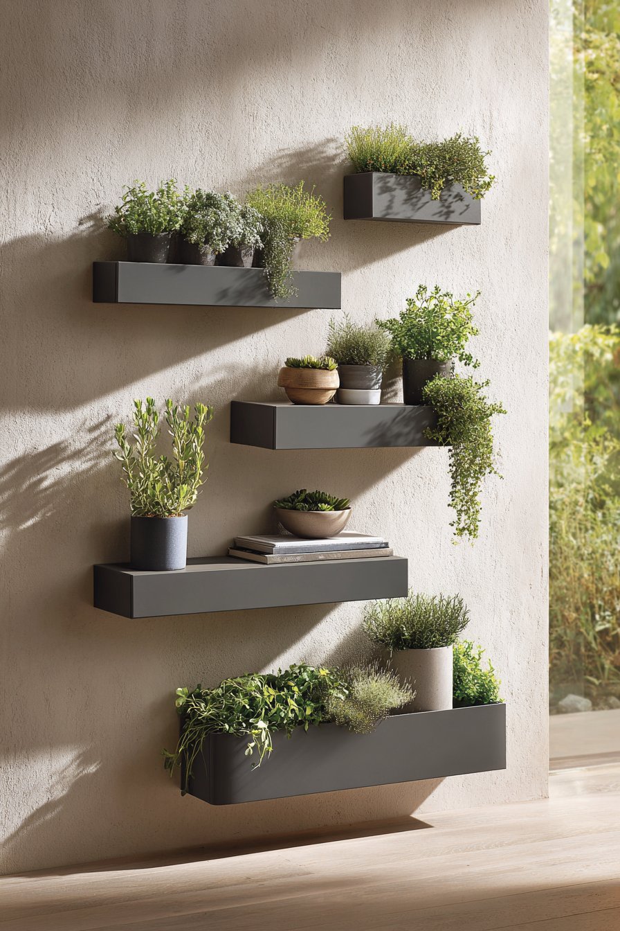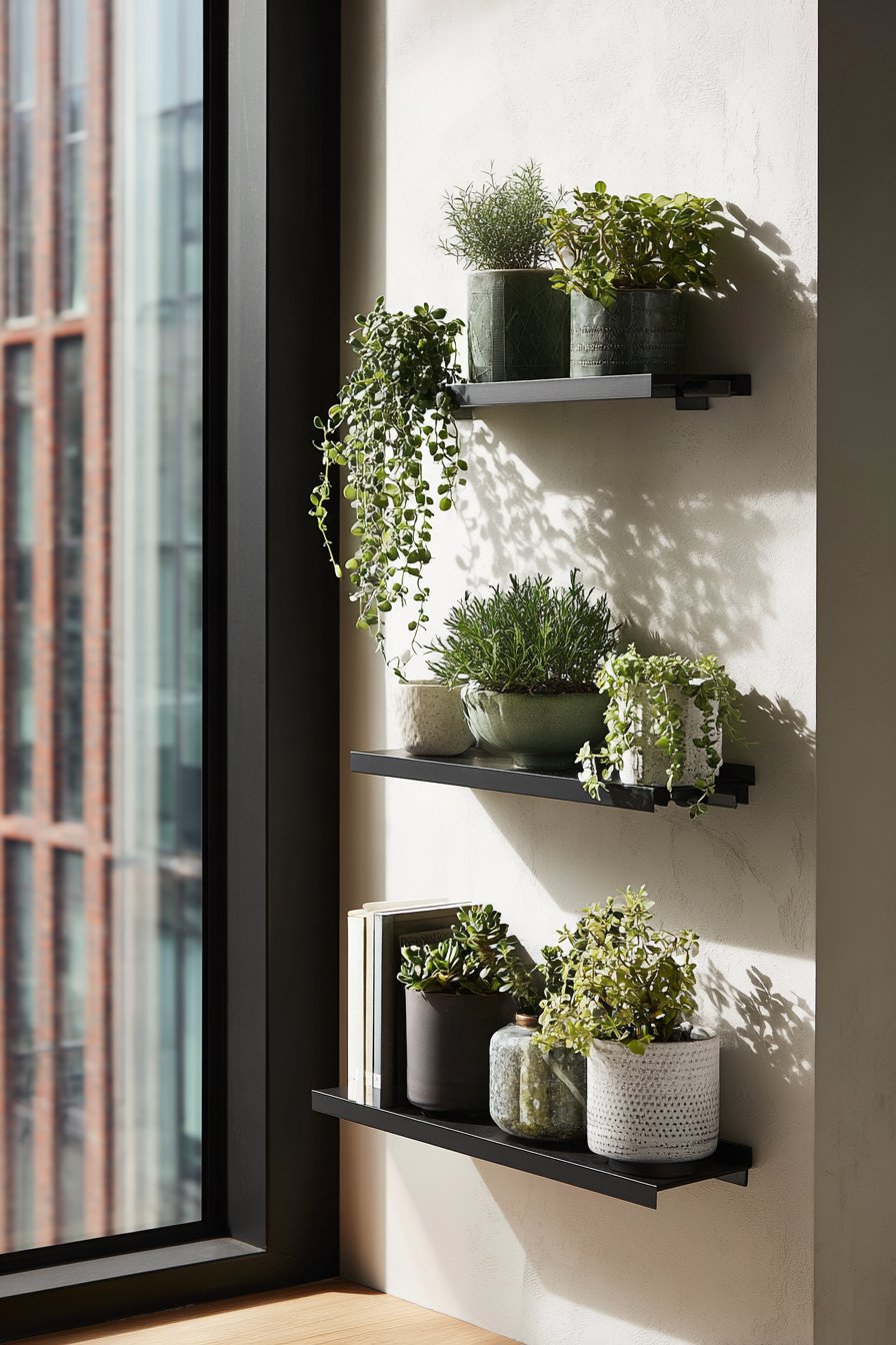 Proving that impactful plant displays don’t require expansive space, ultra-slim vertical shelves mounted on a wall create an indoor plant shelf idea perfectly suited to compact apartments, narrow hallways, or any space where square footage comes at a premium. Three narrow floating shelves in sleek matte black metal consume minimal wall width—perhaps only 4 to 6 inches deep—yet provide surprisingly adequate space for petite planters holding herbs, succulents, and small trailing plants. The vertical orientation, with shelves stacked at strategic intervals, draws the eye upward and creates the illusion of height, a valuable trick in smaller spaces where every design choice must work harder to enhance rather than diminish the sense of openness.