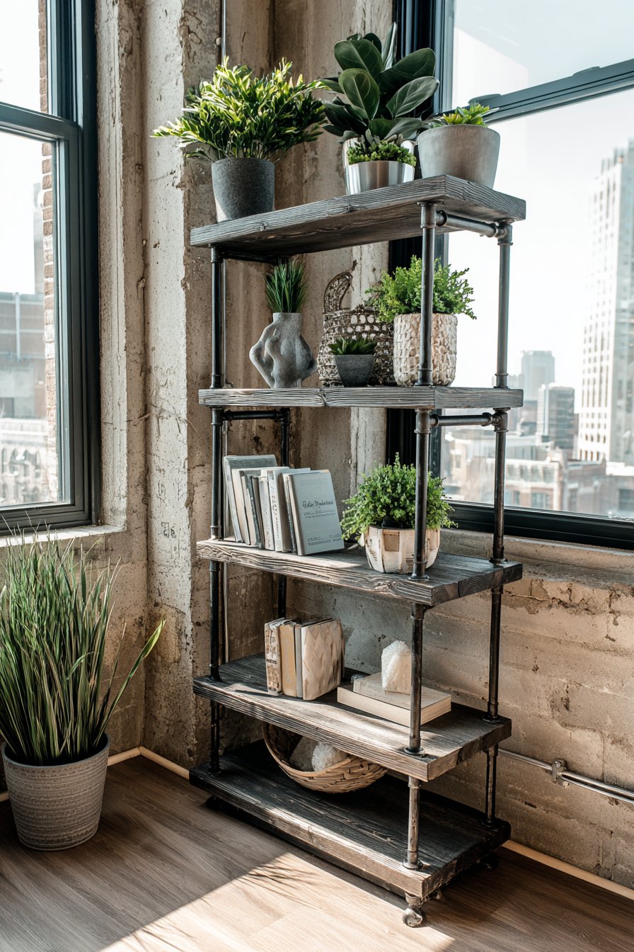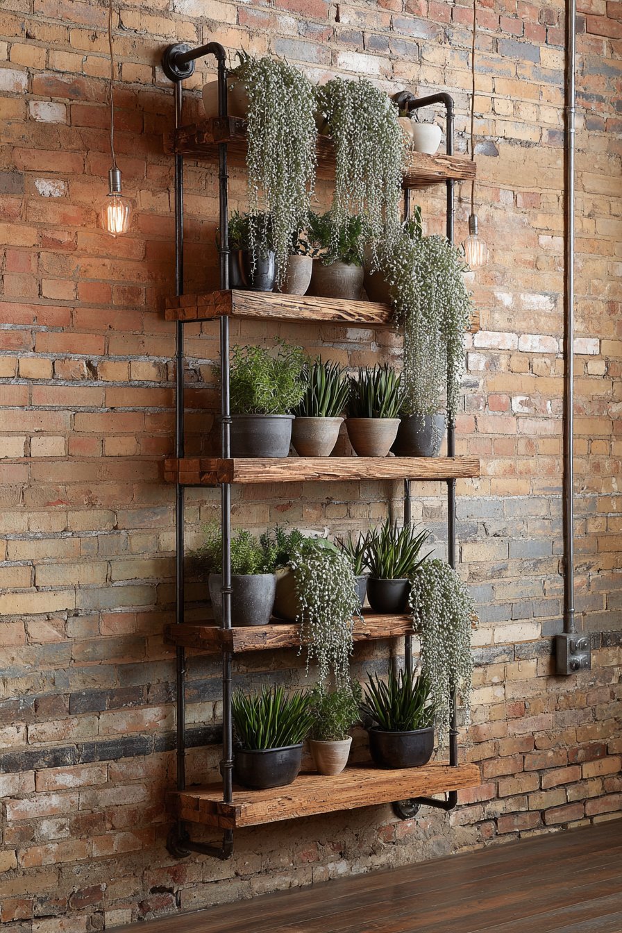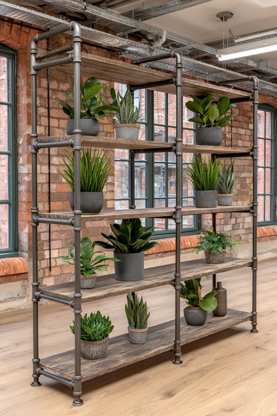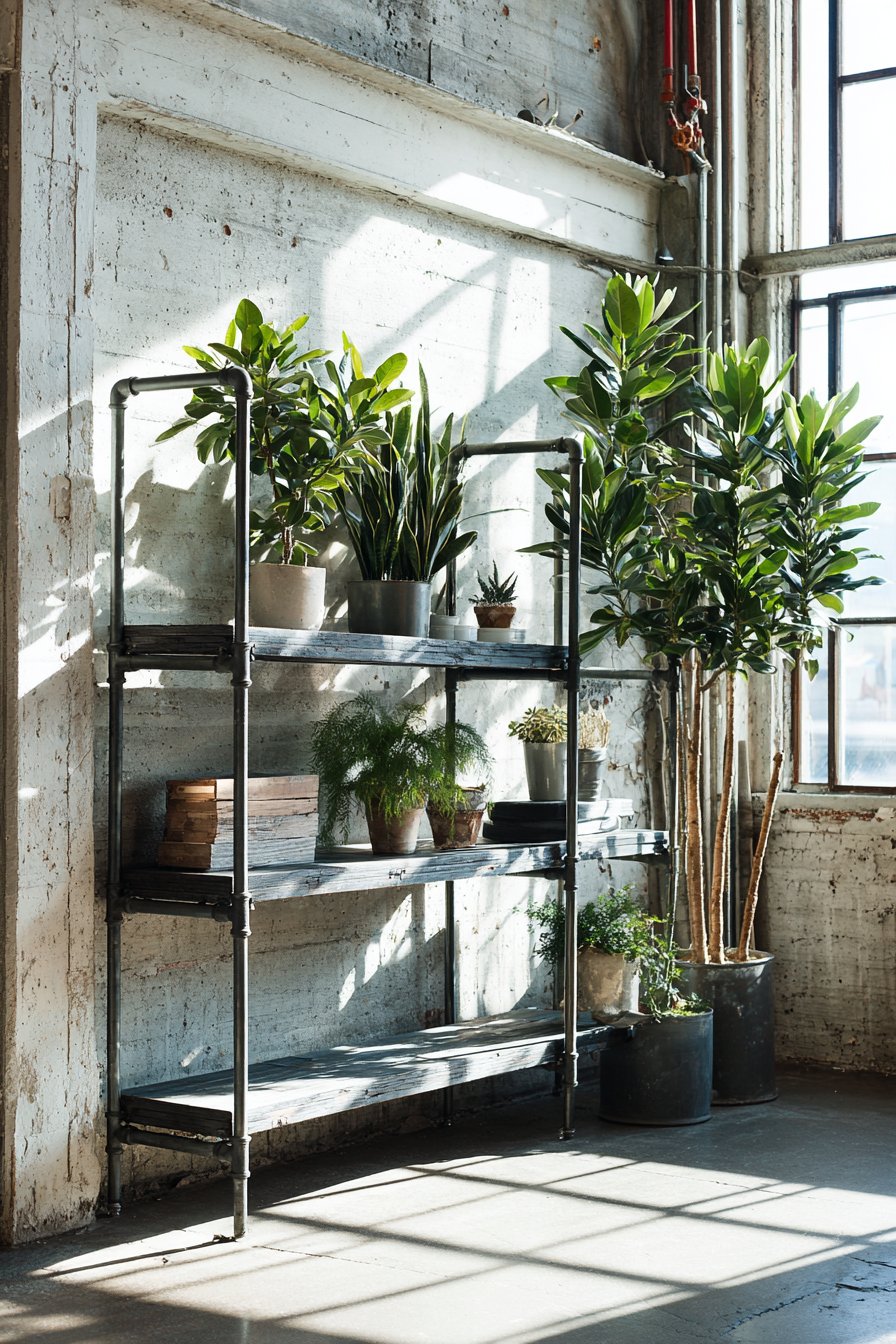 Bold and architectural, an industrial-style shelving unit constructed from metal pipes and reclaimed wood planks makes a powerful statement against exposed brick walls. This indoor plant shelf idea channels the raw, utilitarian aesthetic of converted warehouse spaces, where function and form merge without pretense. Five substantial shelves crafted from salvaged wood—complete with natural imperfections, nail holes, and varied patina—rest on a framework of black metal pipes and fittings. The robust construction doesn’t just support plants; it creates a sculptural element that defines the space. Large statement plants like glossy-leafed rubber trees and architectural dracaena varieties command attention on lower shelves, their substantial forms matching the weighty presence of the industrial materials. Middle tiers host a carefully curated mix of smaller ferns, snake plants, and clustered succulents in modern matte black planters that echo the metal framework.