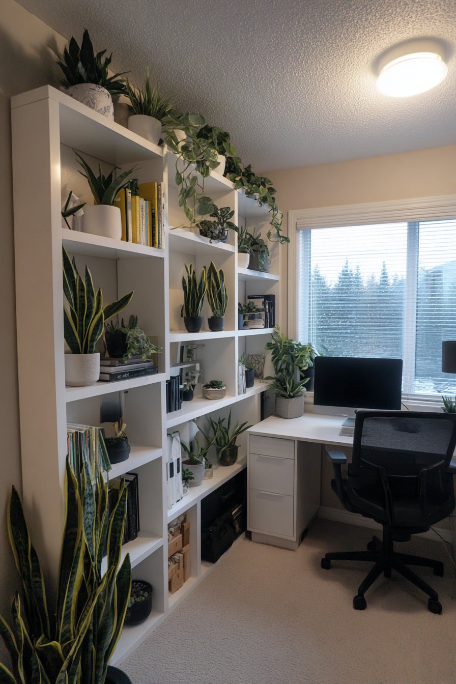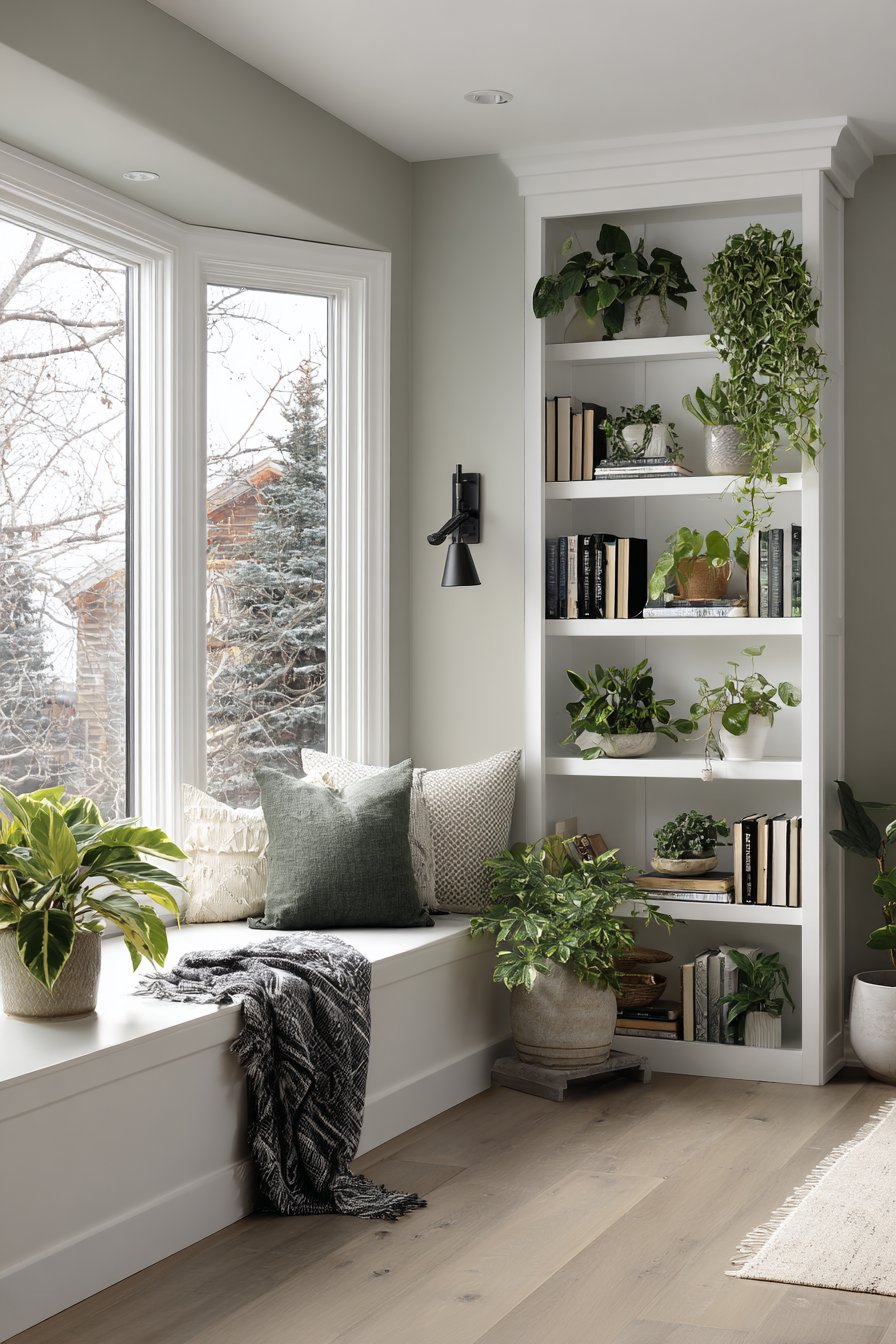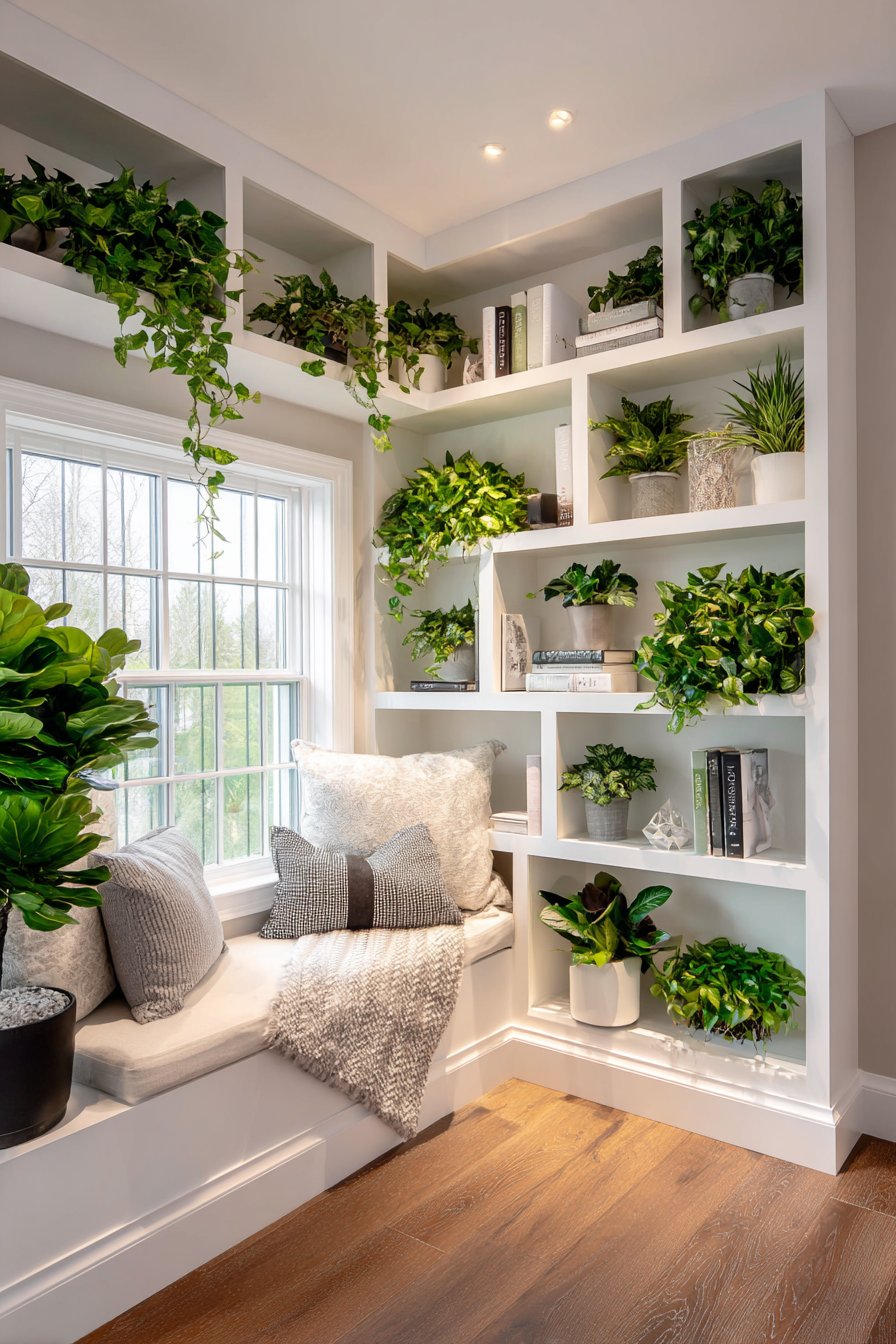 Creating a sanctuary for both literary and botanical pursuits, floor-to-ceiling built-in shelving wrapping around a window seat transforms an ordinary corner into a reading nook where plants and books coexist harmoniously. This indoor plant shelf idea represents the ultimate integration of multiple lifestyle needs into a single, cohesive design. The custom white-painted shelving provides structural framework while the window seat creates a destination—a specific place to sit, relax, and disconnect from digital distractions. Lower shelves hold larger plants whose substantial forms ground the space and create a sense of enclosure; spider plants send out cascading runners, peace lilies contribute glossy leaves and occasional white blooms, and pothos vines trail gracefully along shelf edges. Upper shelves display smaller plant varieties interspersed with beloved books, creating a visual rhythm that alternates between greenery and bound volumes.