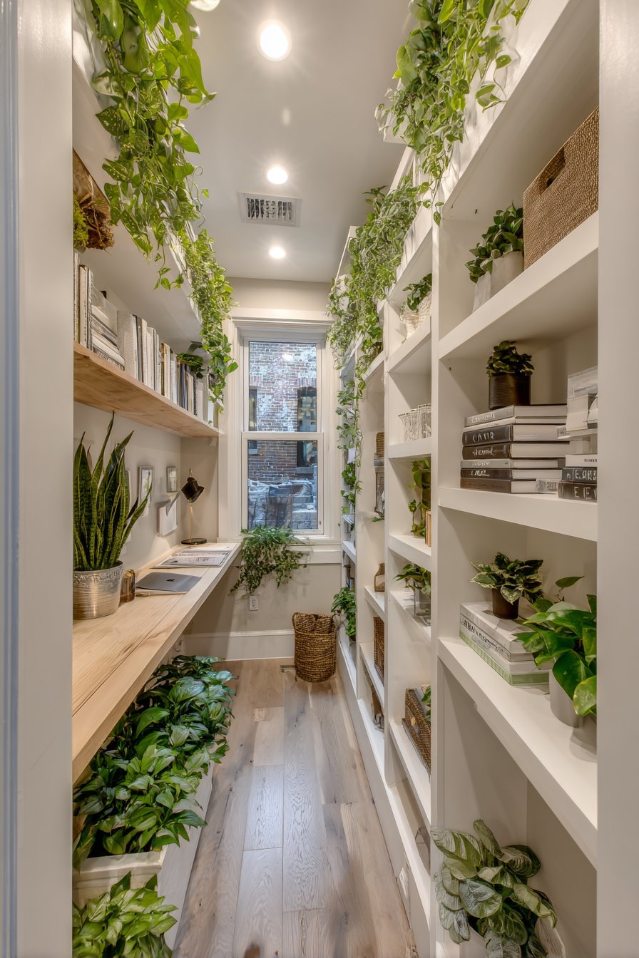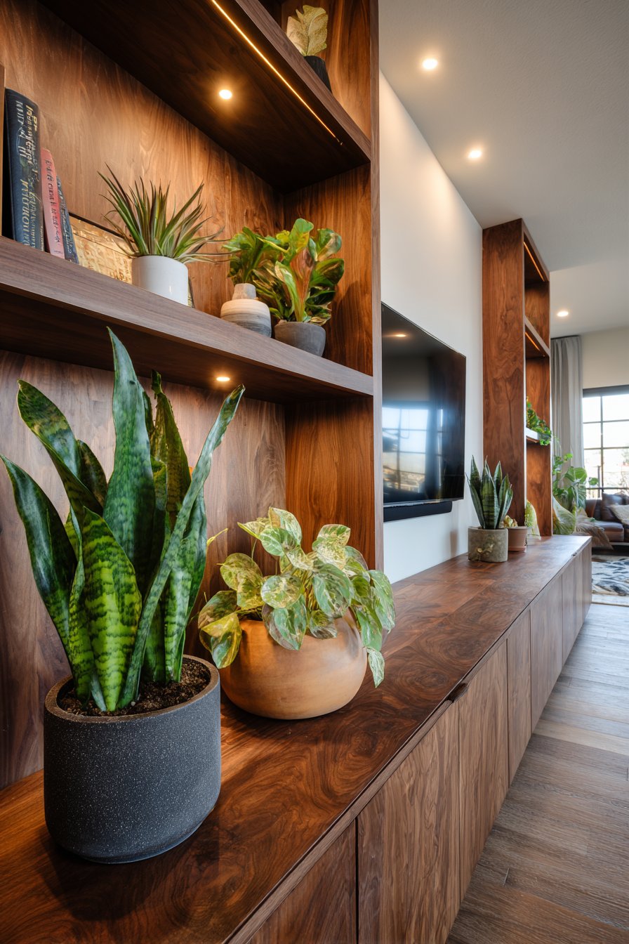 - Use trailing plants on upper shelves to soften the built-in’s structured lines