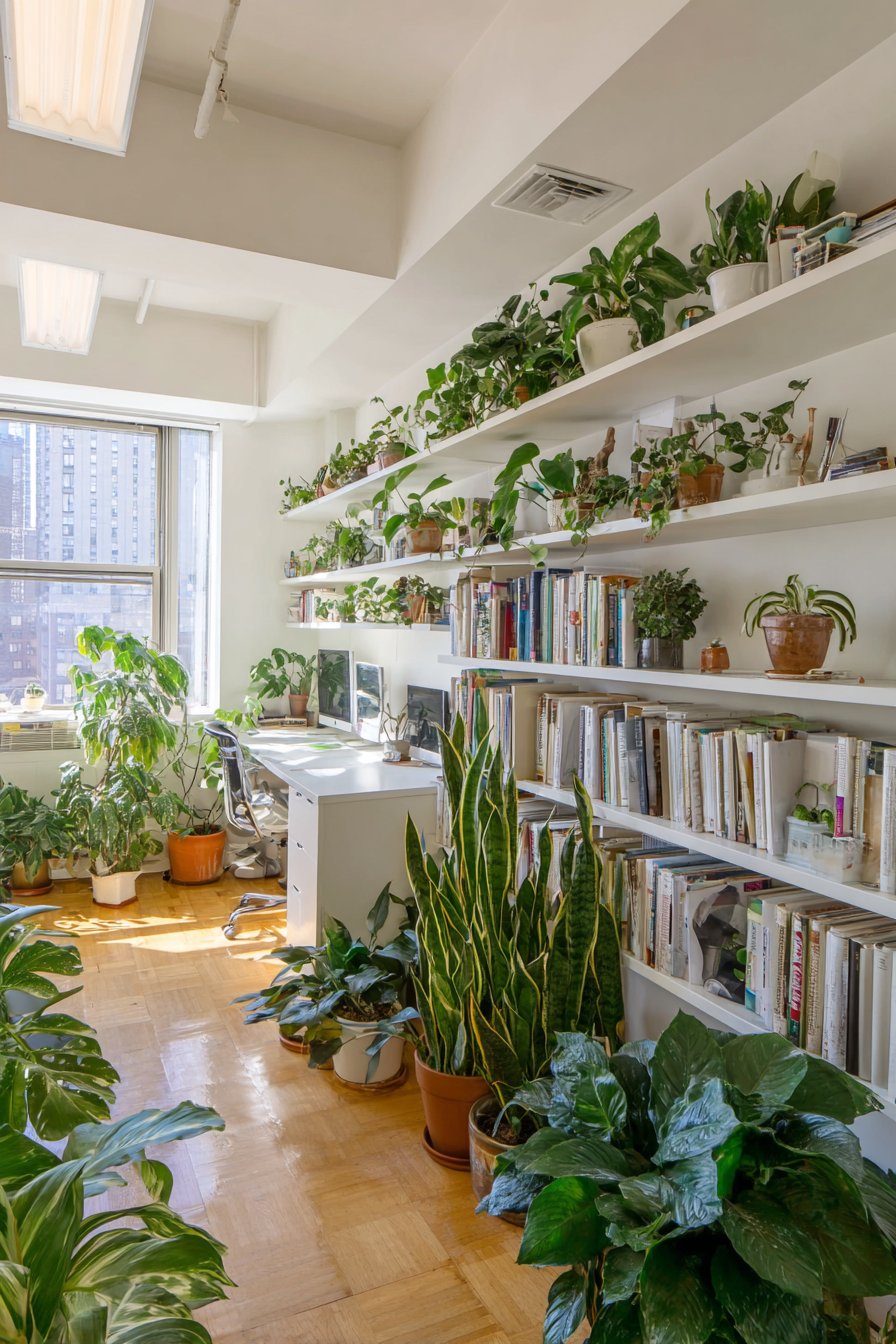 This design exemplifies how thoughtful space planning can accommodate multiple needs simultaneously rather than forcing choices between competing priorities. The same square footage serves as library, meditation space, plant display, and favorite reading spot. The integration feels organic rather than forced because the functions complement rather than contradict each other: both books and plants reward quiet contemplation, both benefit from good natural light, and both contribute to creating homes that nourish minds and spirits rather than serving merely as utilitarian shelters. This indoor plant shelf idea resonates particularly with those who view their homes as sanctuaries—places to retreat from the world’s demands into personal space dedicated to whatever brings joy, peace, and renewal.